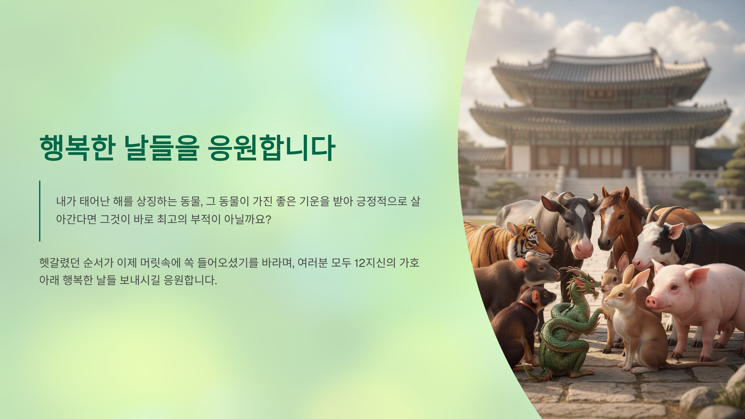 내가 태어난 해를 상징하는 동물, 그 동물이 가진 좋은 기운을 받아 긍정적으로 살아간다면 그것이 바로 최고의 부적이 아닐까요? 헷갈렸던 순서가 이제 머릿속에 쏙 들어오셨기를 바라며, 여러분 모두 12지신의 가호 아래 행복한 날들 보내시길 응원합니다.