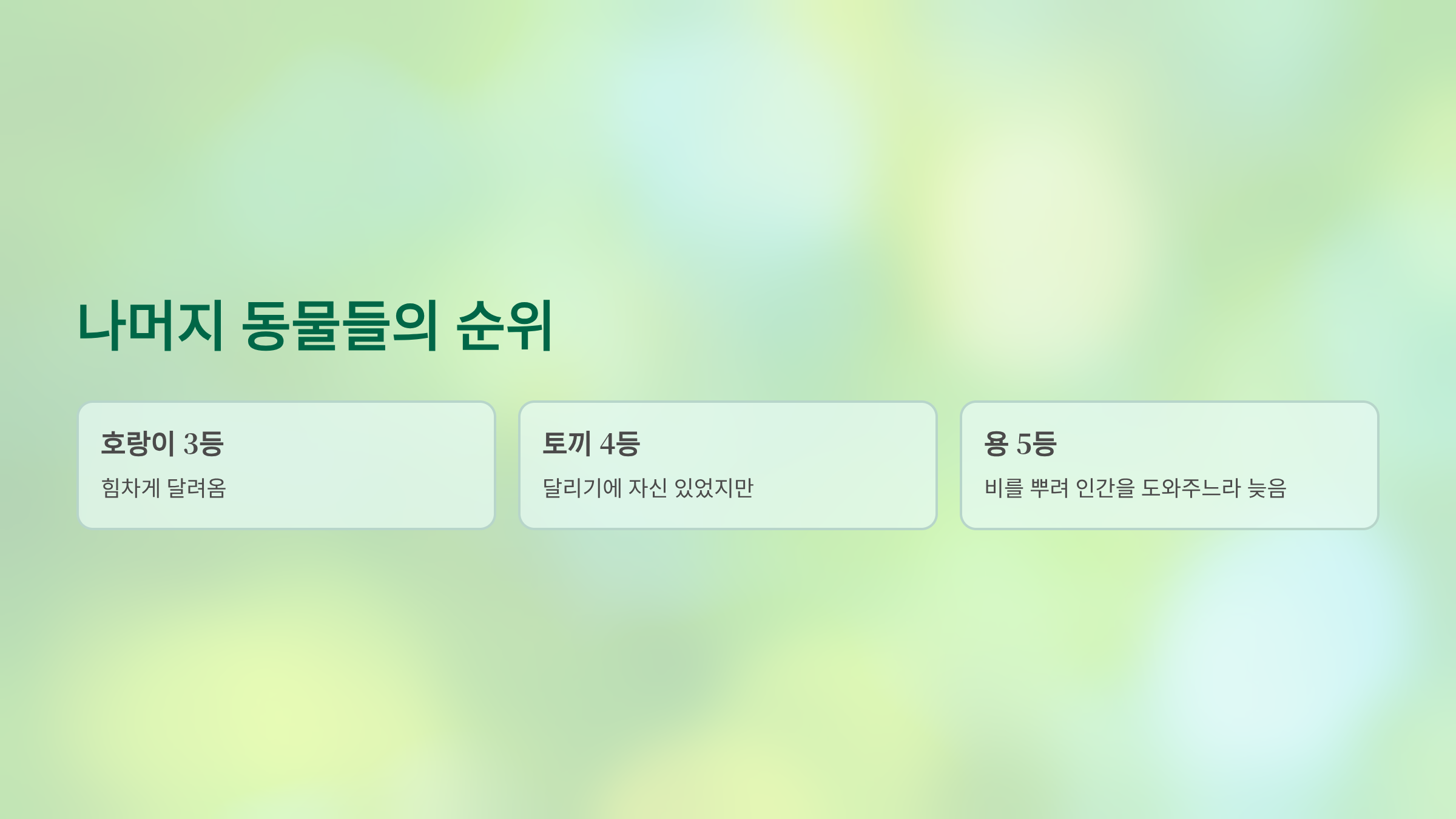 그 뒤를 이어 호랑이가 3등, 달리기에 자신 있던 토끼가 4등으로 들어왔습니다. 용은 날 수 있어서 1등이 유력했지만, 오는 길에 비를 뿌려 인간들을 도와주느라 늦어서 5등이 되었다고 합니다.