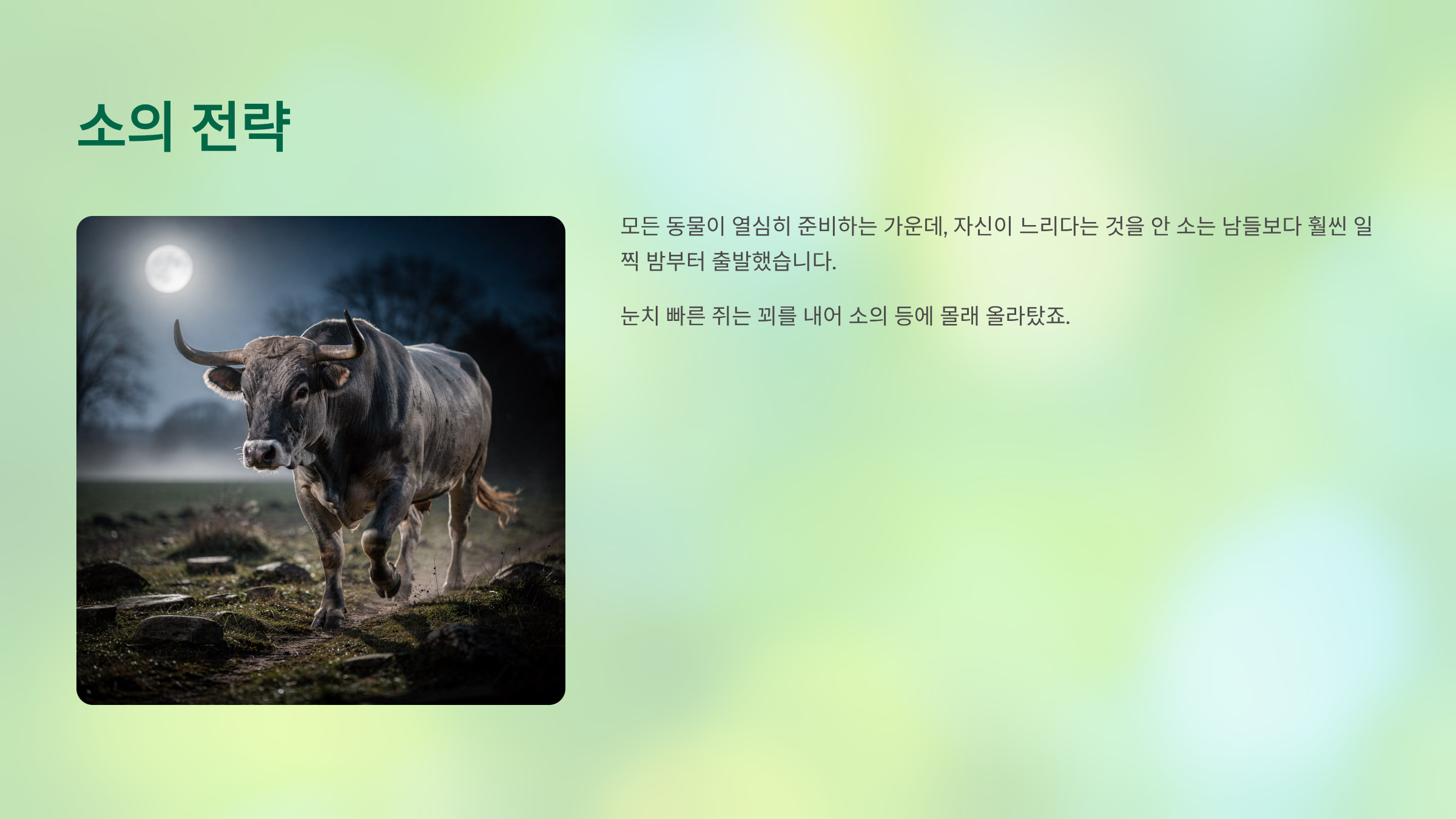 모든 동물이 열심히 준비하는 가운데, 자신이 느리다는 것을 안 소는 남들보다 훨씬 일찍 밤부터 출발했습니다. 눈치 빠른 쥐는 꾀를 내어 소의 등에 몰래 올라탔죠.