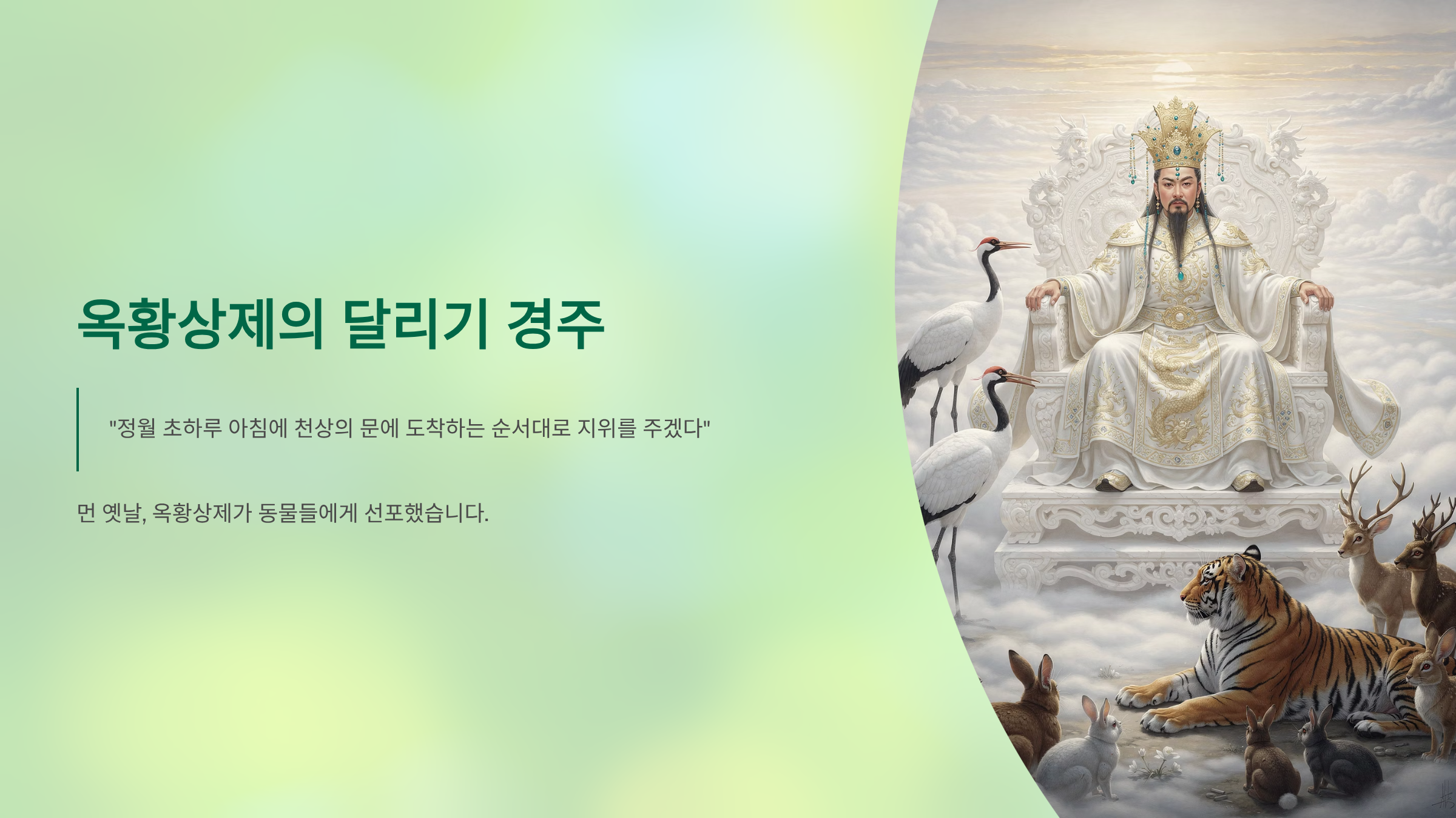 먼 옛날, 옥황상제가 동물들에게 "정월 초하루 아침에 천상의 문에 도착하는 순서대로 지위를 주겠다"라고 선포했습니다.