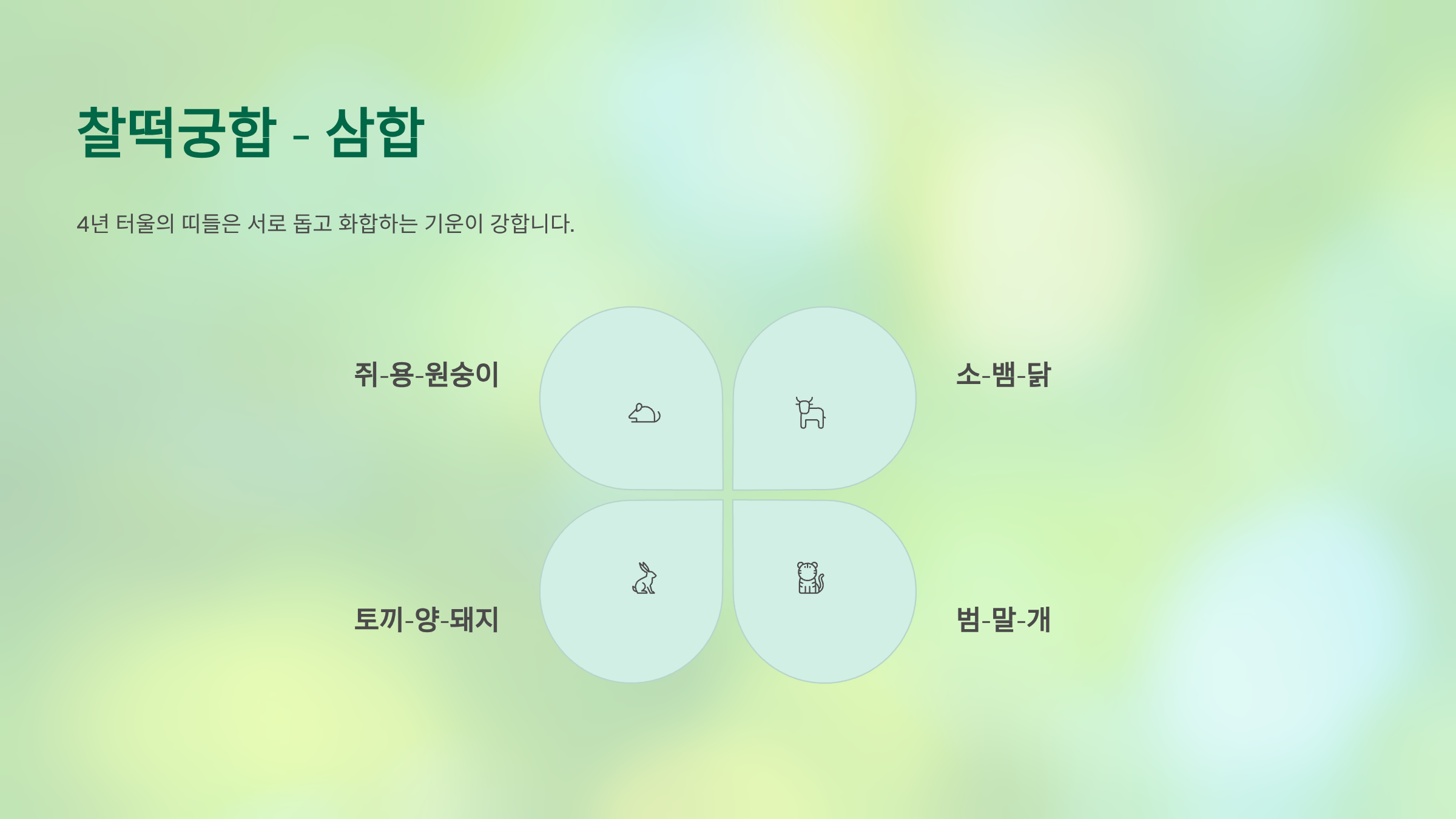 삼합 (아주 좋은 궁합): 4년 터울의 띠들은 서로 돕고 화합하는 기운이 강합니다.
