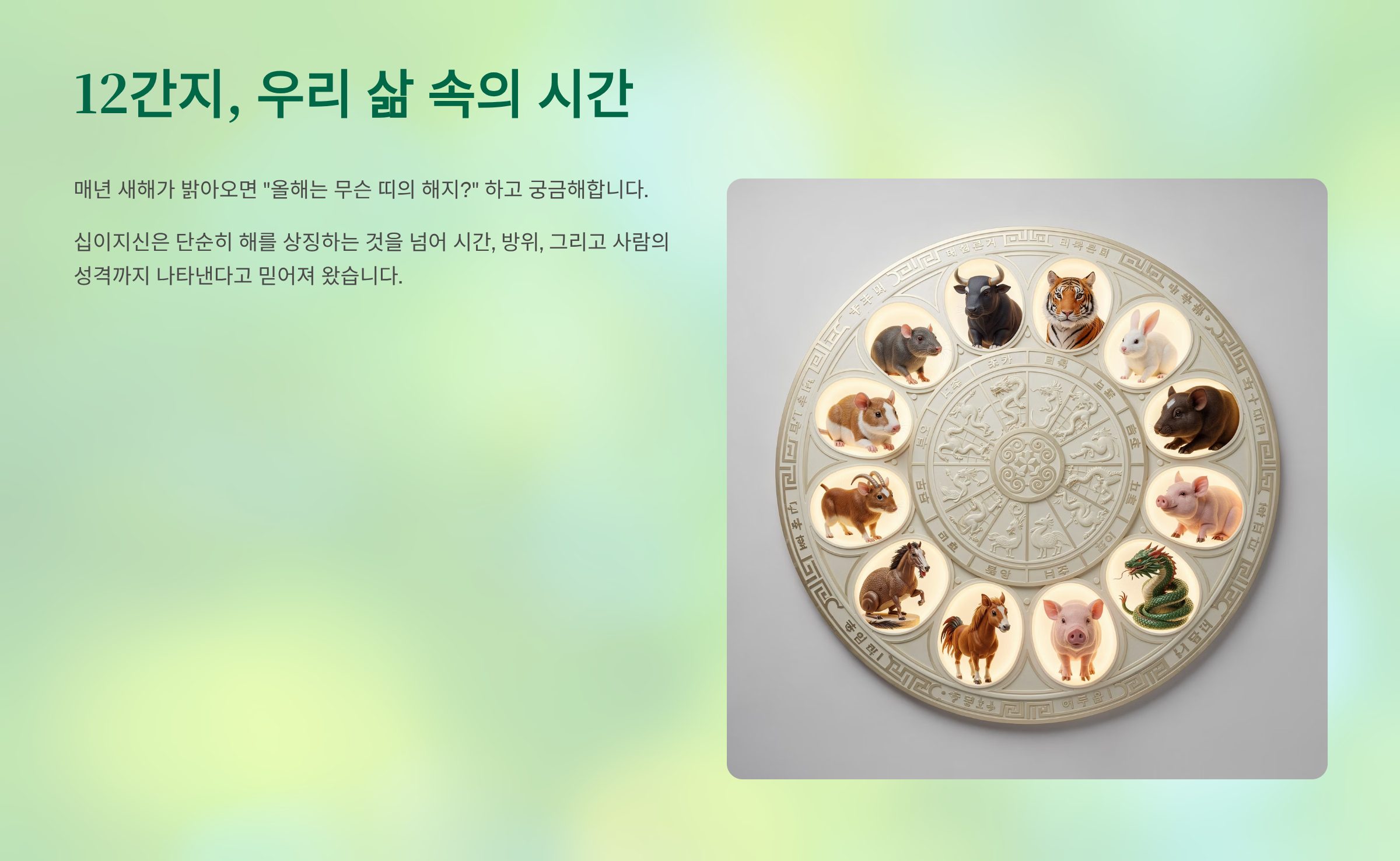 안녕하세요. 매년 새해가 밝아오면 "올해는 무슨 띠의 해지?" 하고 궁금해하곤 합니다. 우리 생활 깊숙이 자리 잡은 12간지, 즉 십이지신은 단순히 해를 상징하는 것을 넘어 시간, 방위, 그리고 사람의 성격까지 나타낸다고 믿어져 왔습니다.