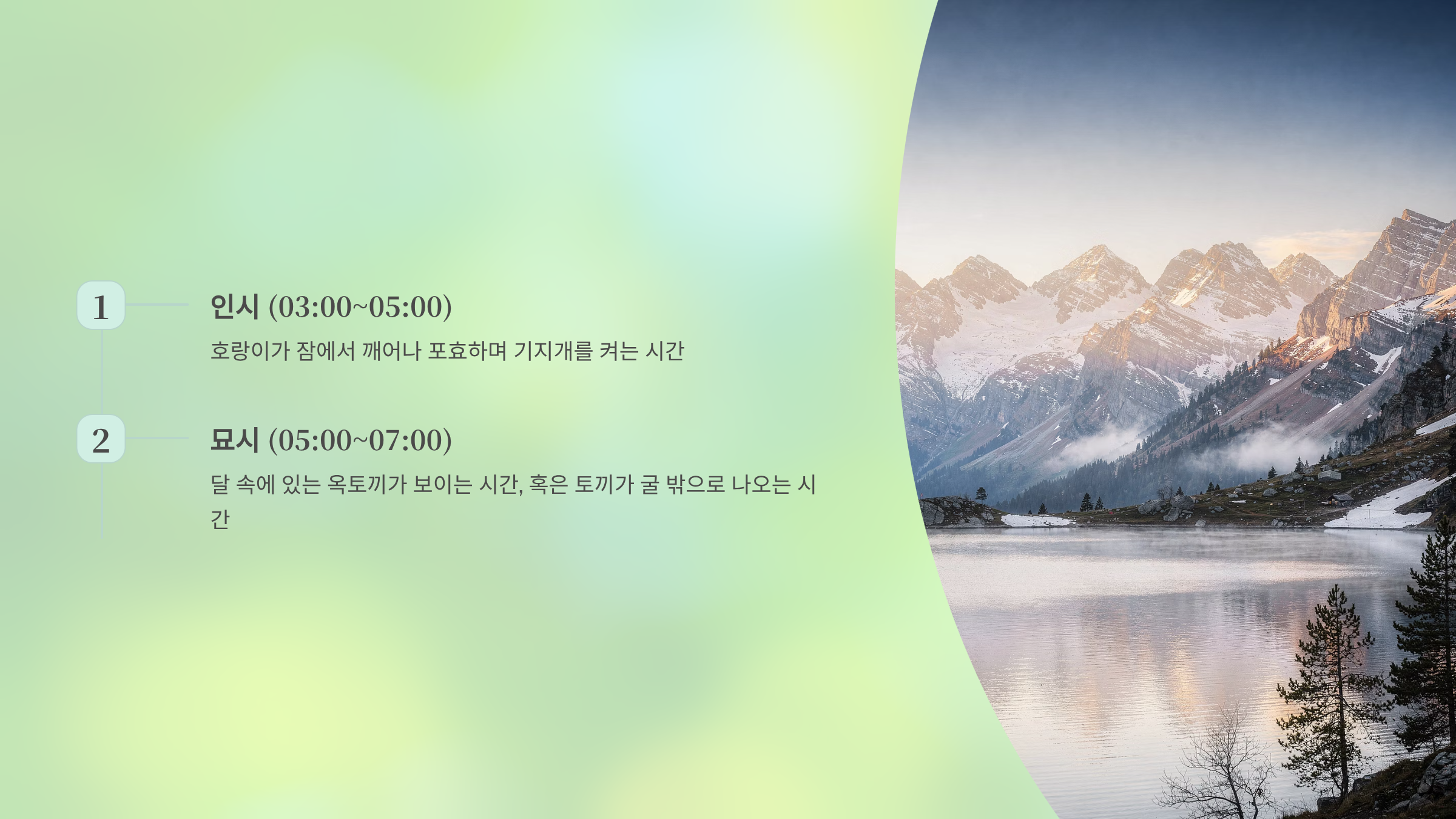묘시 (05:00 ~ 07:00): 달 속에 있는 옥토끼가 보이는 시간, 혹은 토끼가 굴 밖으로 나오는 시간입니다.