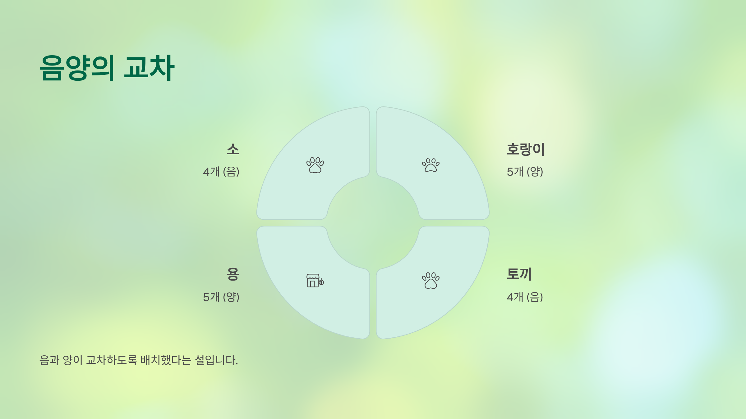 그 뒤로는 소(4개), 호랑이(5개), 토끼(4개), 용(5개), 뱀(0개-혀가 갈라져 2개로 침), 말(1개-통굽), 양(4개), 원숭이(5개), 닭(4개), 개(5개), 돼지(4개) 순으로 음과 양이 교차하도록 배치했다는 설입니다.