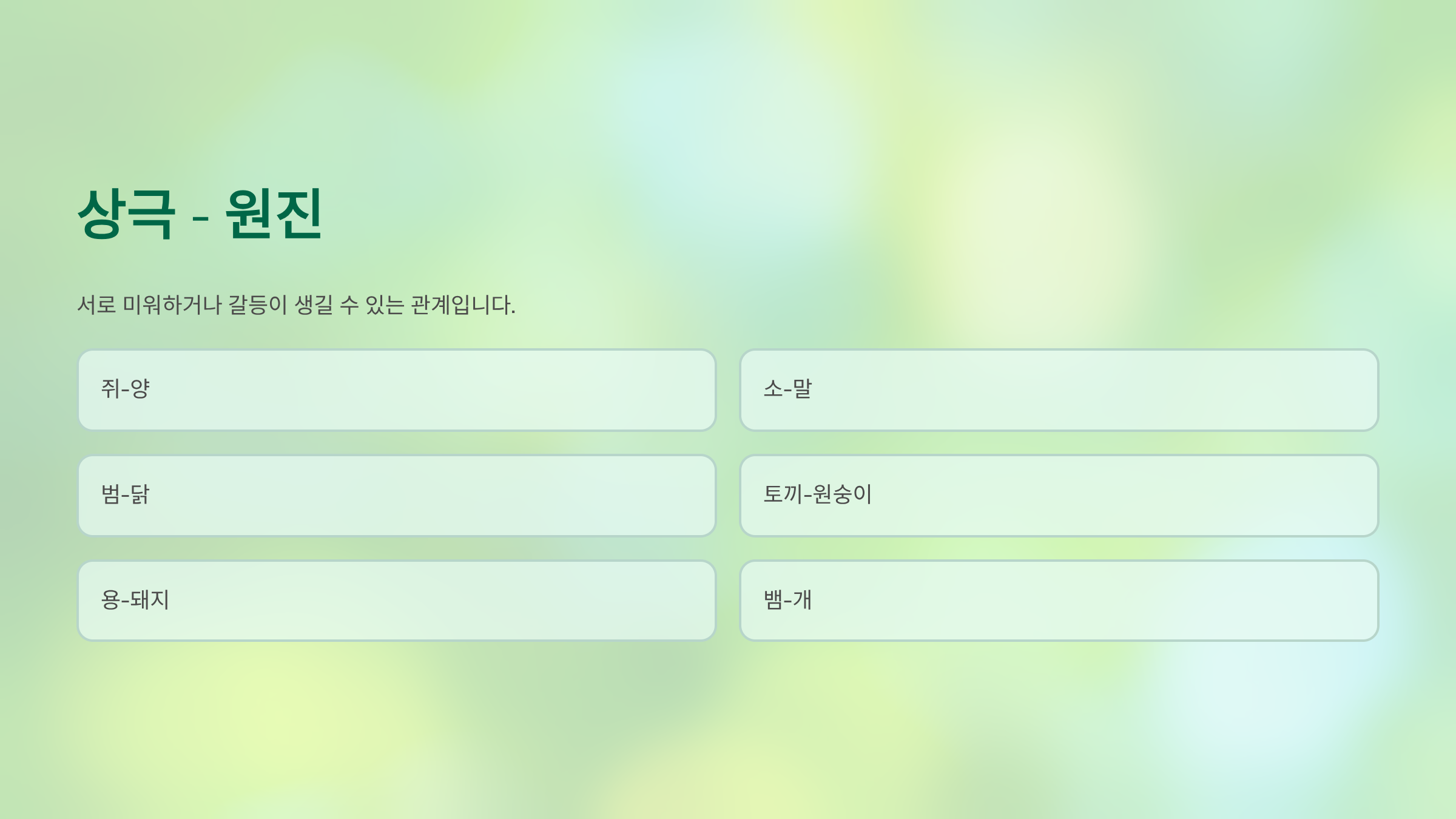 (쥐-양 / 소-말 / 범-닭 / 토끼-원숭이 / 용-돼지 / 뱀-개)