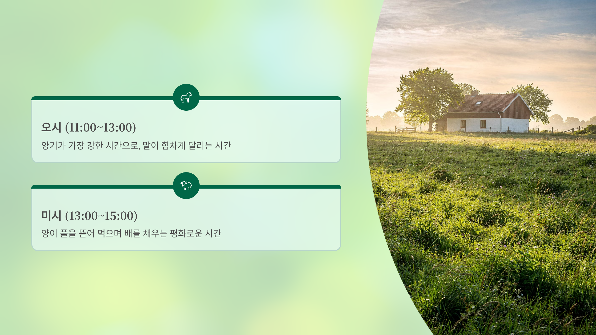 미시 (13:00 ~ 15:00): 양이 풀을 뜯어 먹으며 배를 채우는 평화로운 시간입니다.