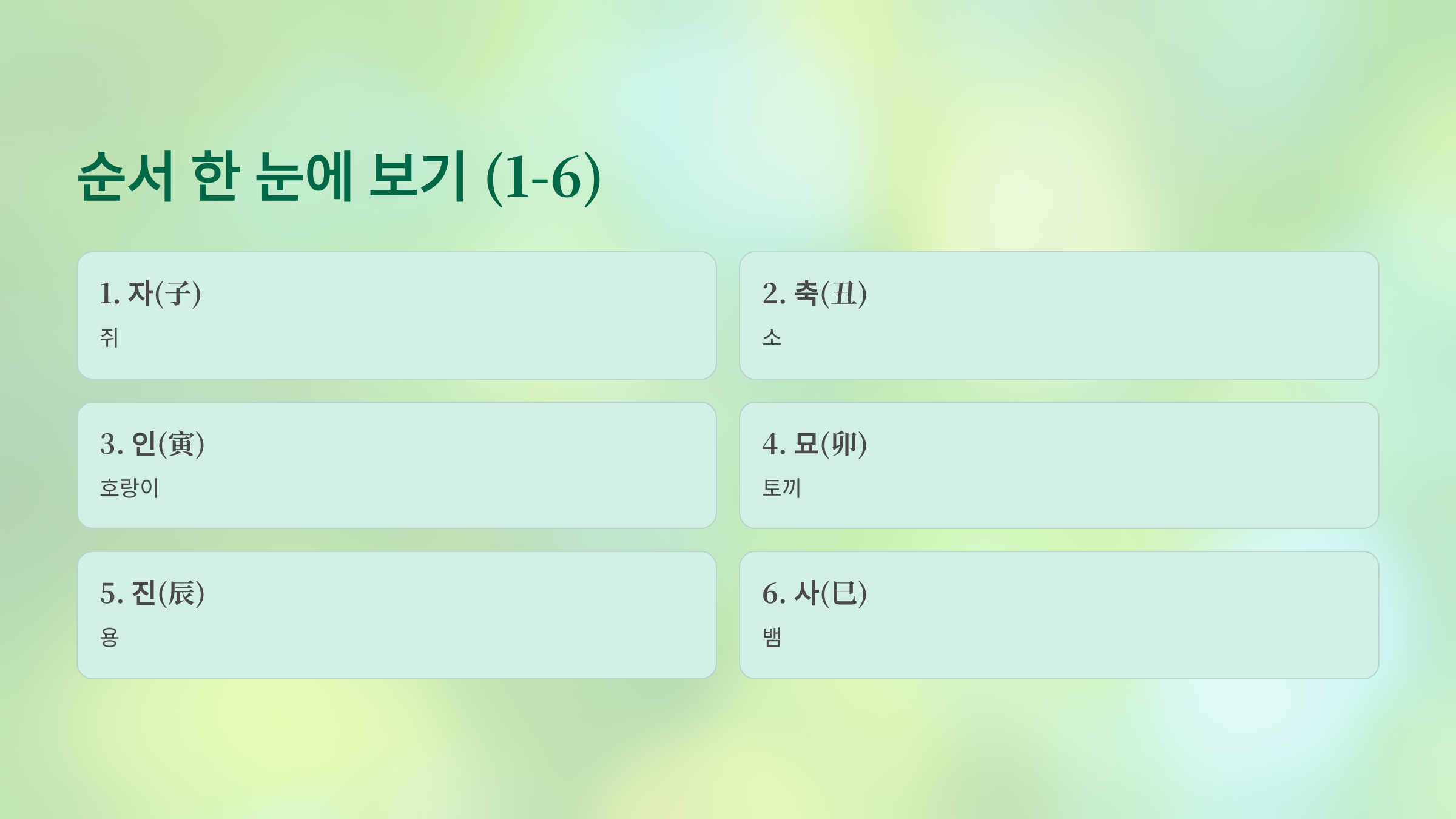 먼저 가장 기본이 되는 순서부터 확실하게 잡고 가겠습니다. 한자와 동물을 짝지어 외우면 훨씬 기억에 오래 남습니다.