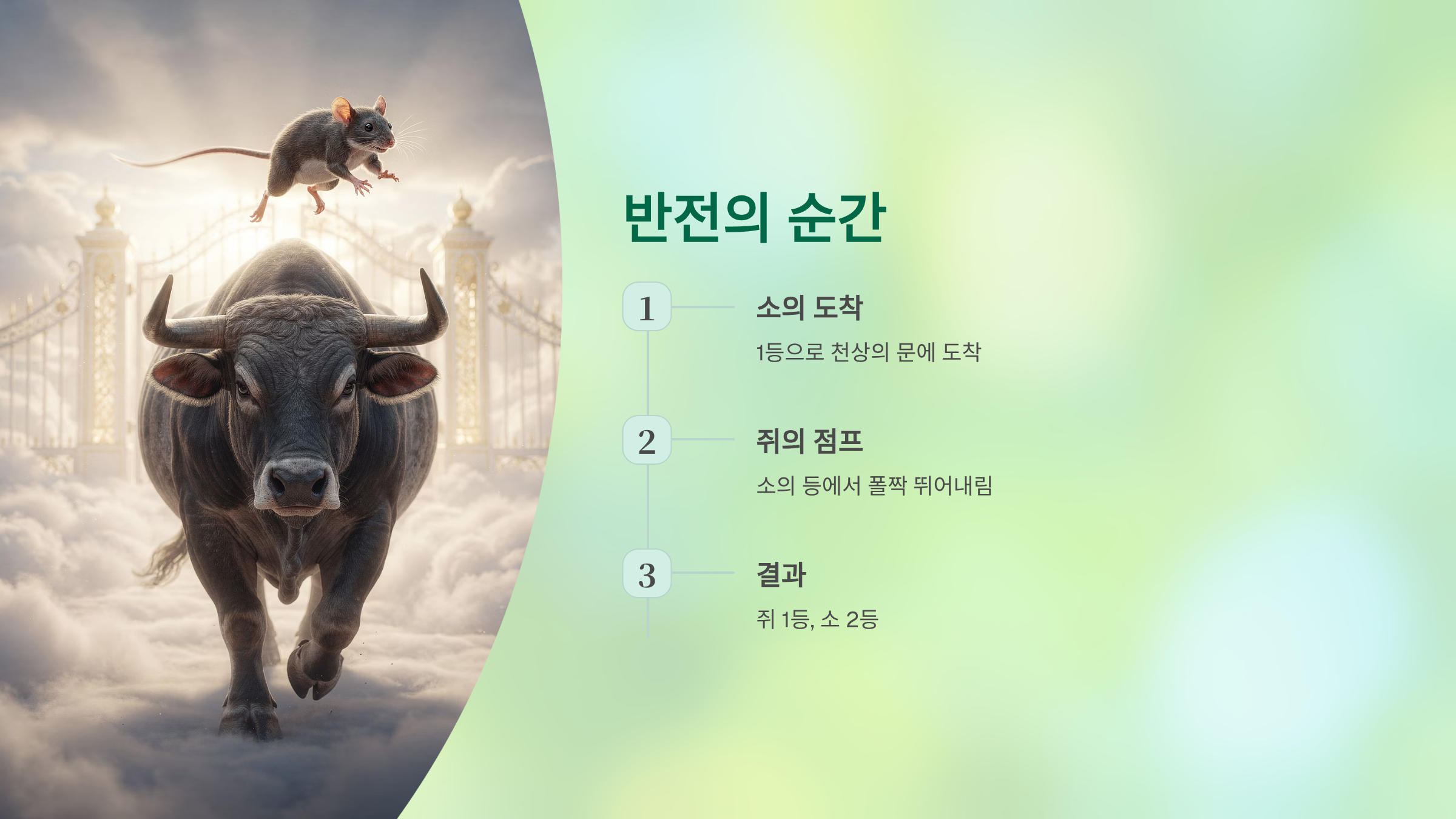 소가 1등으로 천상의 문에 도착하려는 찰나, 쥐가 소의 등에서 폴짝 뛰어내려 가장 먼저 문을 통과했습니다. 그래서 쥐가 1등(자), 억울하지만 소가 2등(축)이 되었습니다.