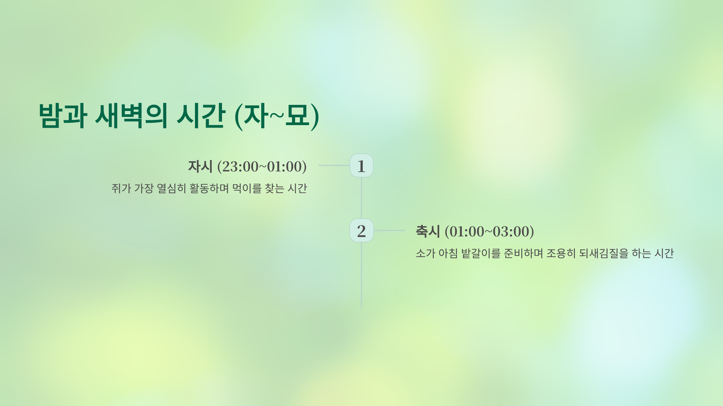 축시 (01:00 ~ 03:00): 소가 아침 밭갈이를 준비하며 조용히 되새김질을 하는 시간입니다.