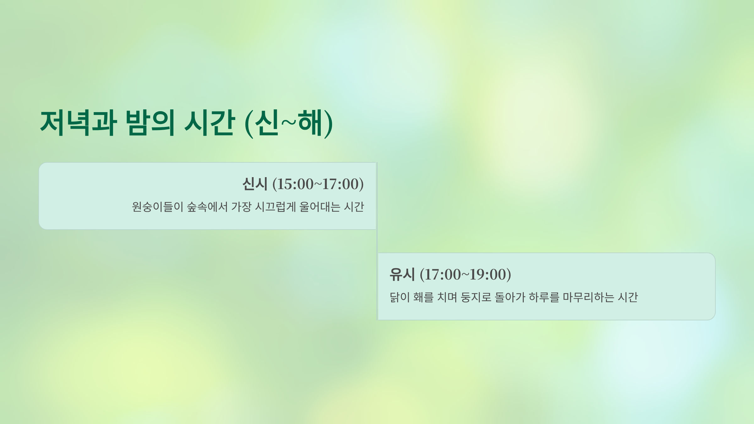 유시 (17:00 ~ 19:00): 닭이 홰를 치며 둥지로 돌아가 하루를 마무리하는 시간입니다.