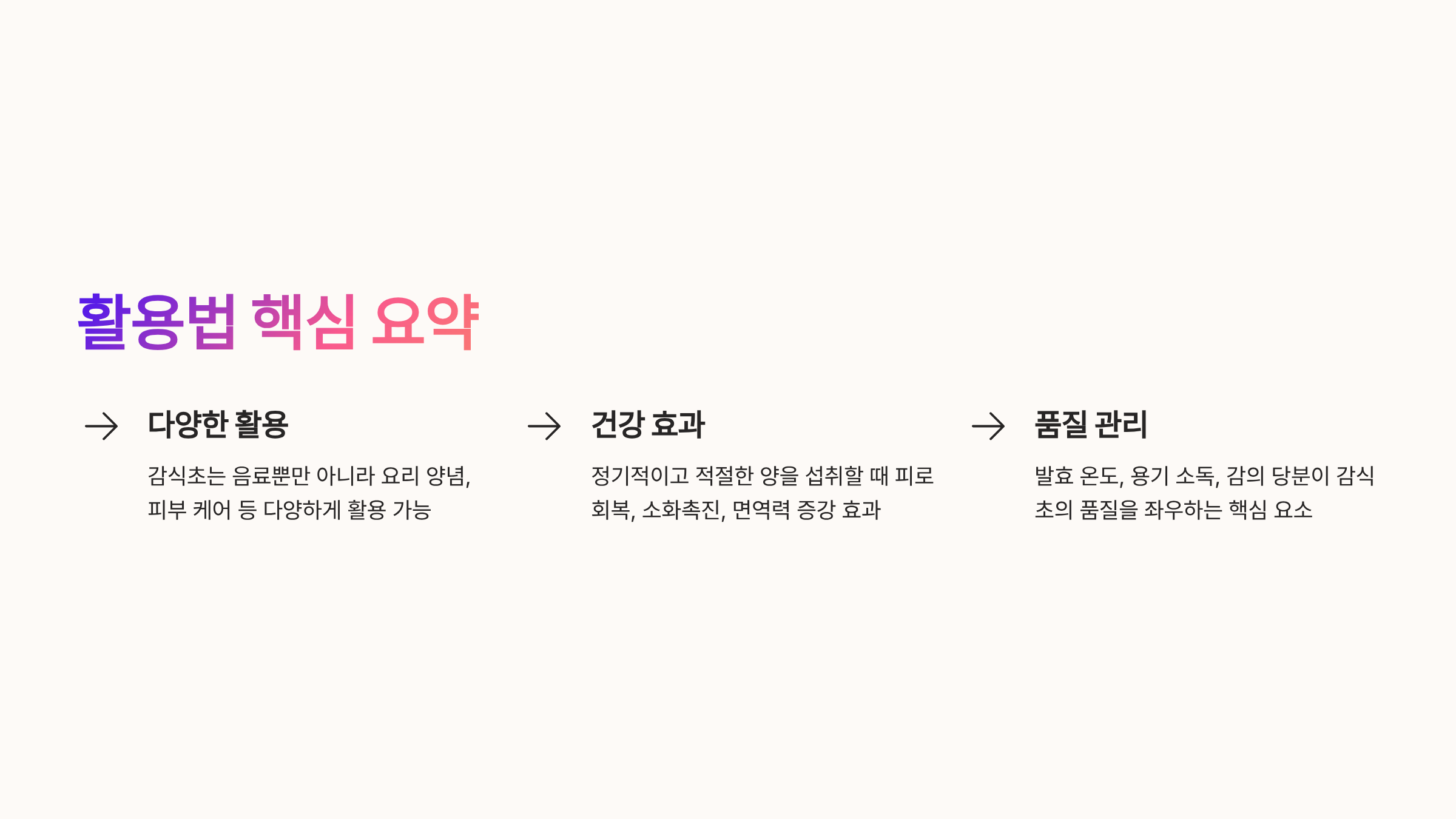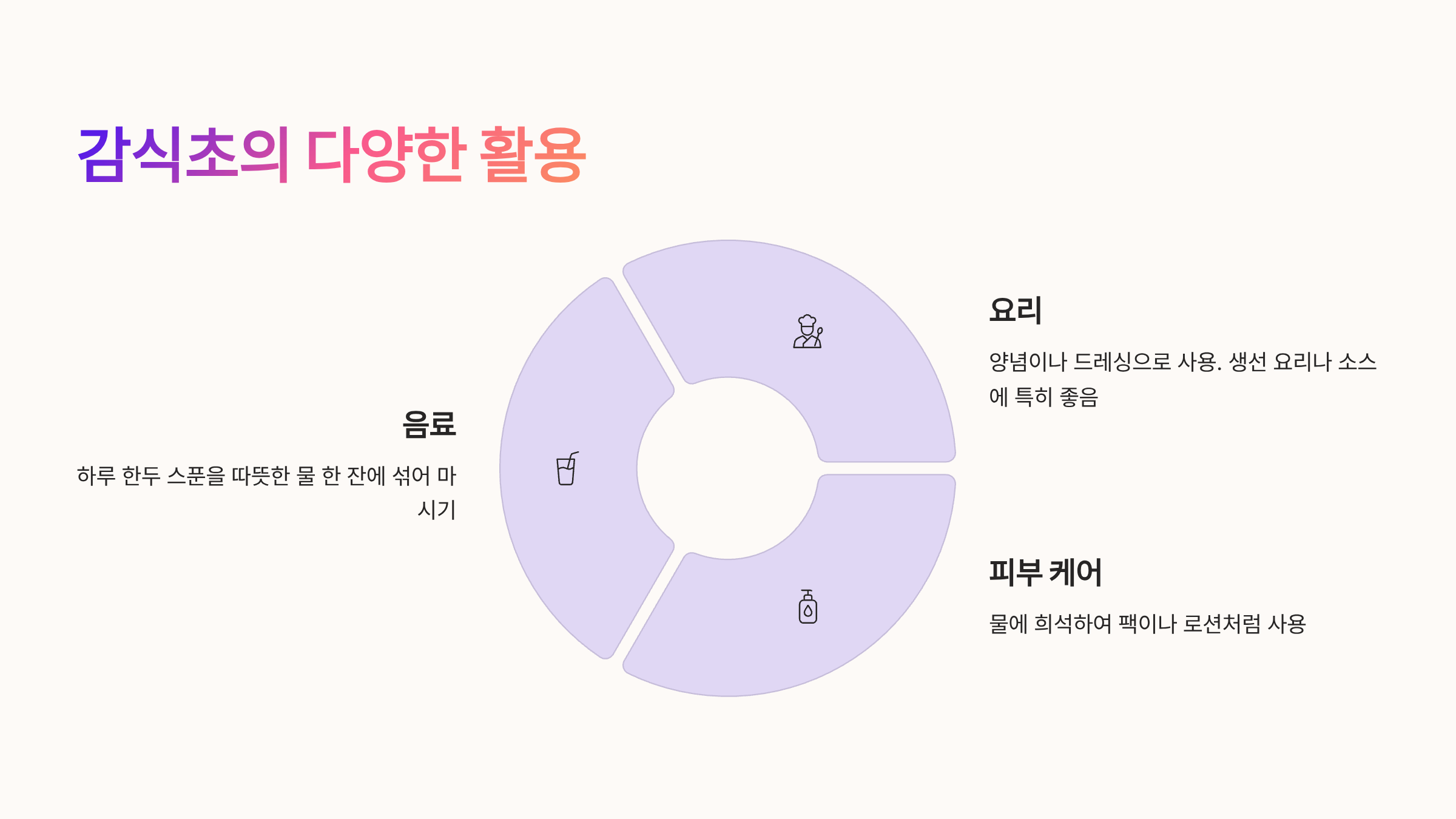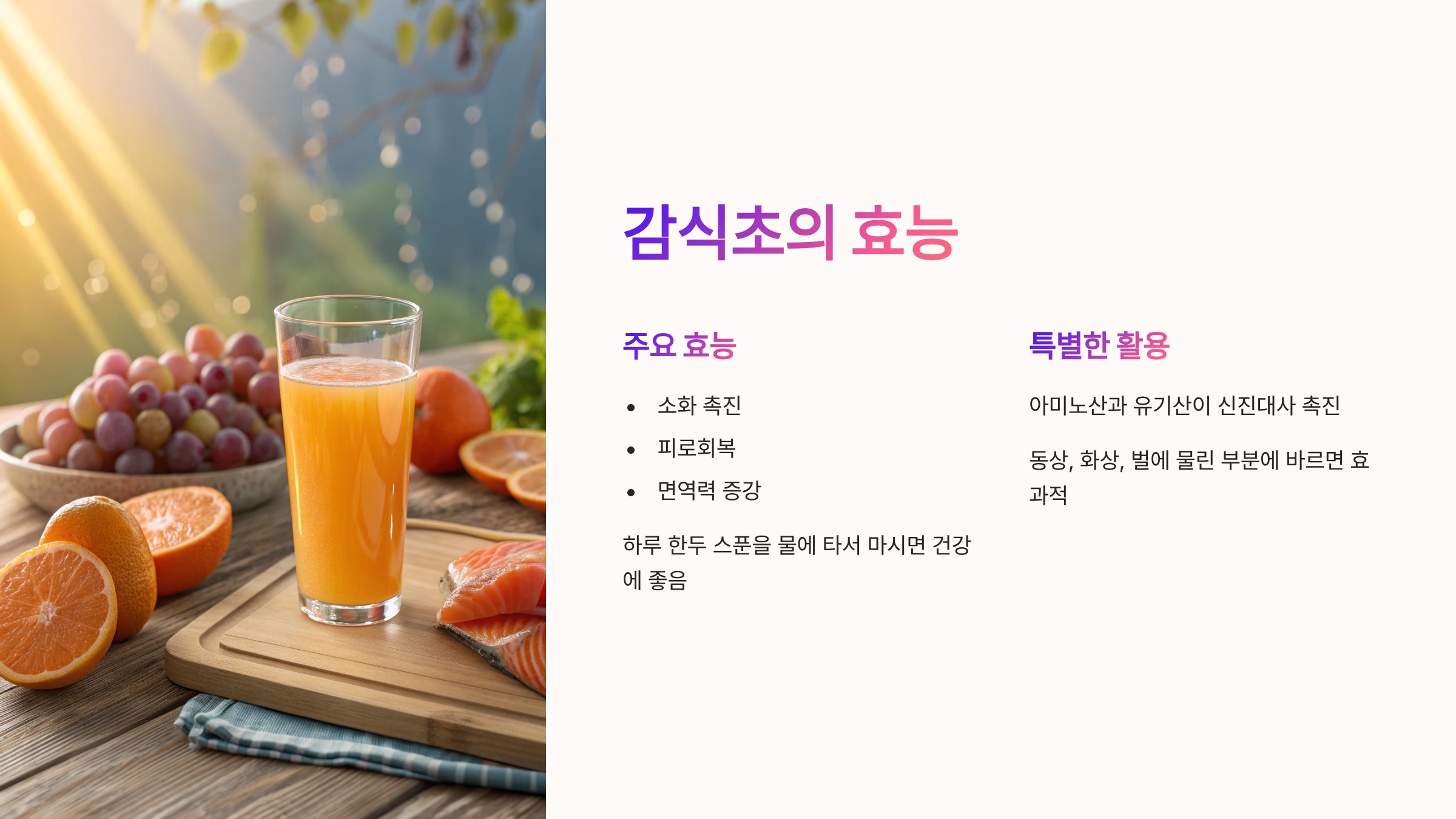 - 감식초는 음료뿐만 아니라 요리 양념, 피부 케어 등 다양하게 활용 가능