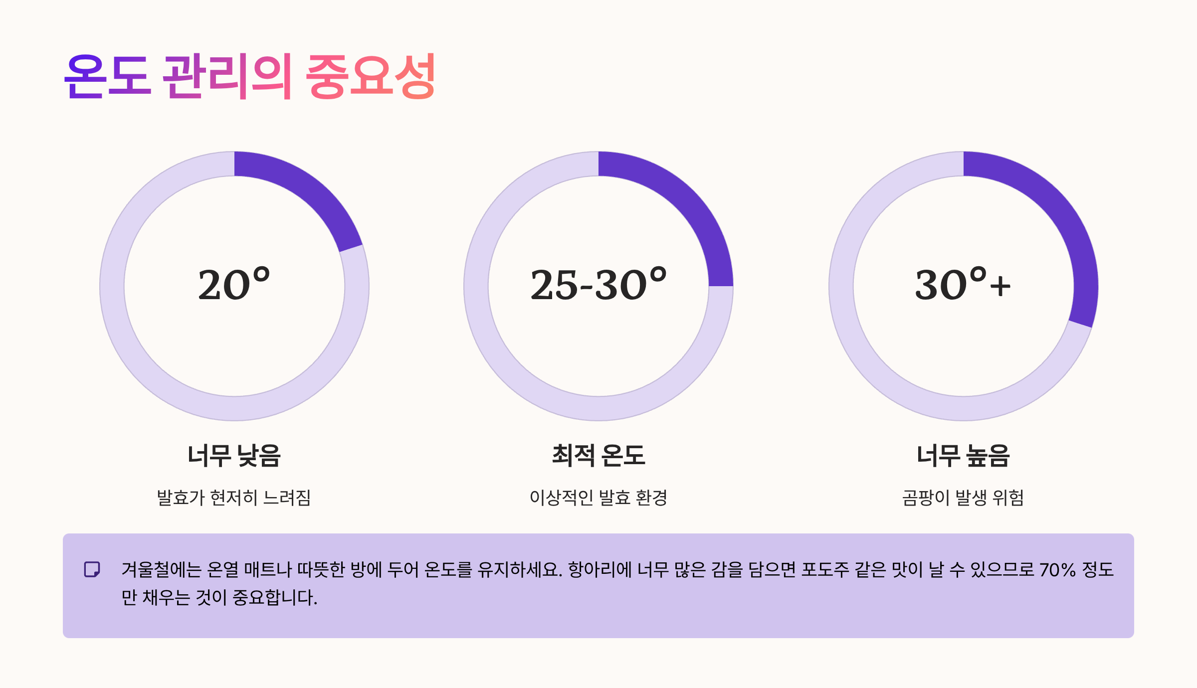 알코올 발효 중에 온도 관리가 가장 중요합니다. 온도가 20도 이하로 떨어지면 발효가 현저히 느려지고, 30도 이상으로 올라가면 곰팡이가 생길 수 있습니다. 겨울철에 만드는 경우 온열 매트나 따뜻한 방에 두어 온도를 유지하세요. 또한 항아리에 너무 많은 감을 담으면 발효 과정에서 포도주 같은 맛이 날 수 있으므로, 항아리의 70% 정도만 채우는 것이 중요합니다.