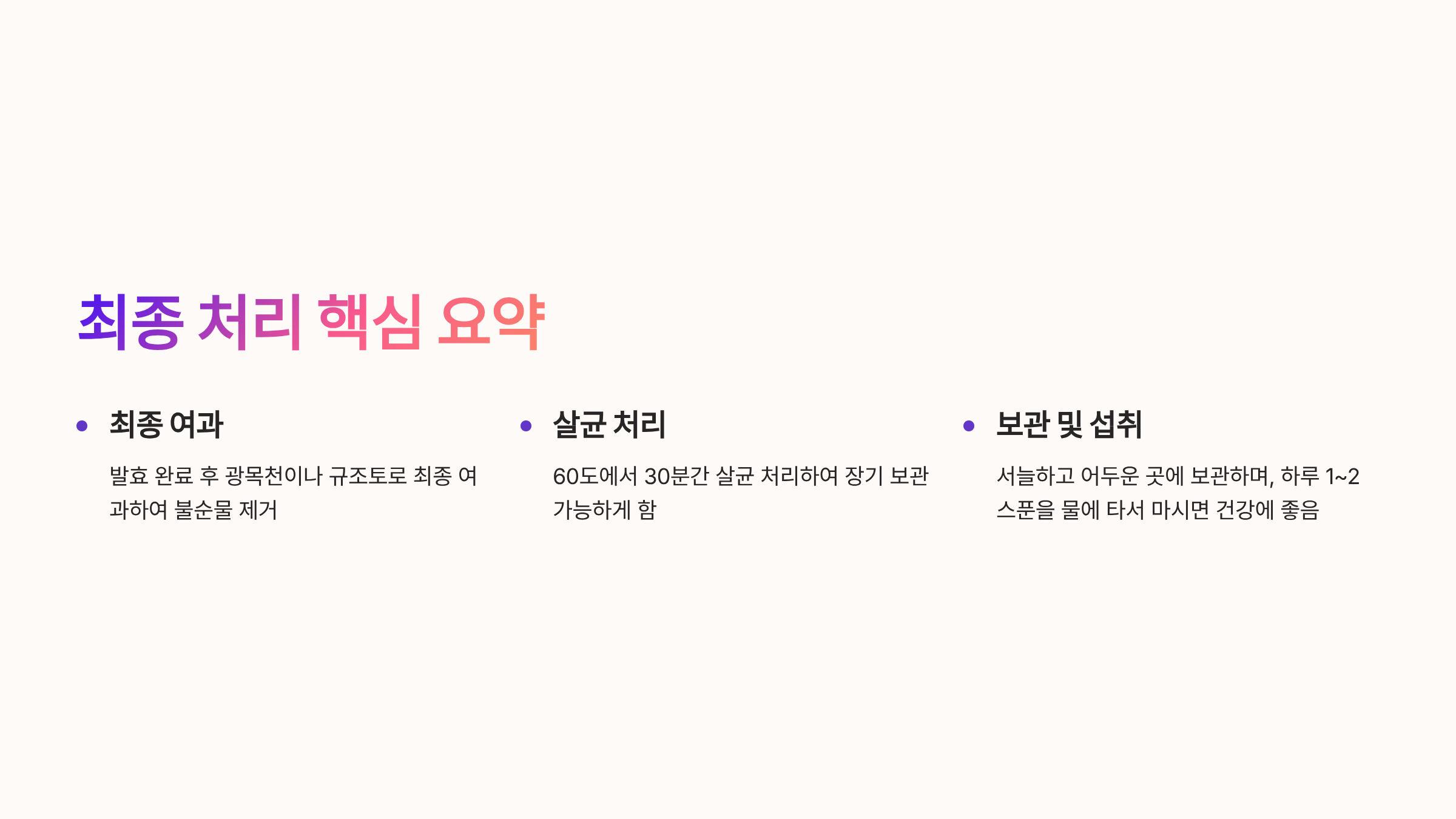 - 60도에서 30분간 살균 처리하여 장기 보관 가능하게 함