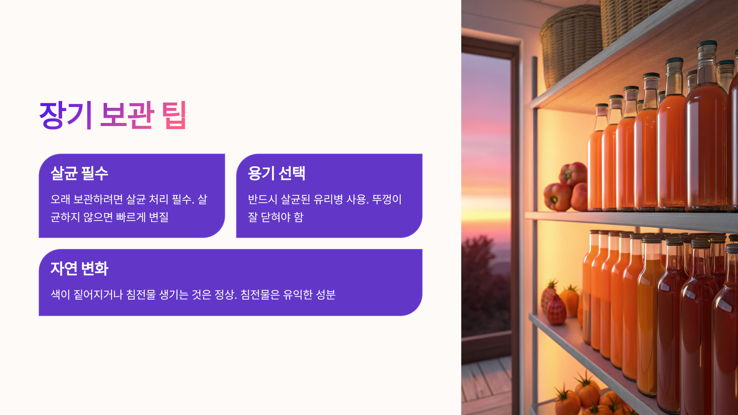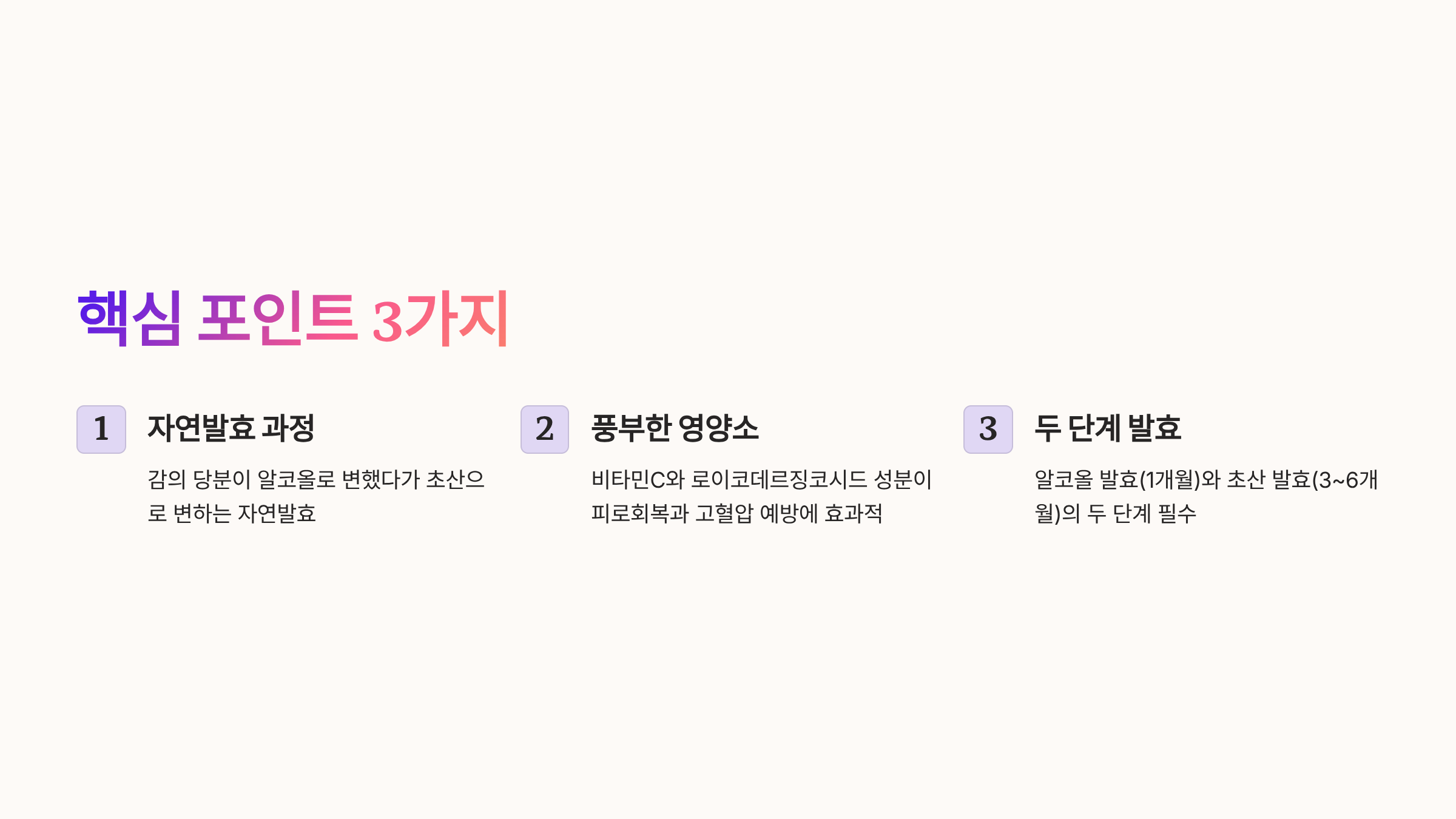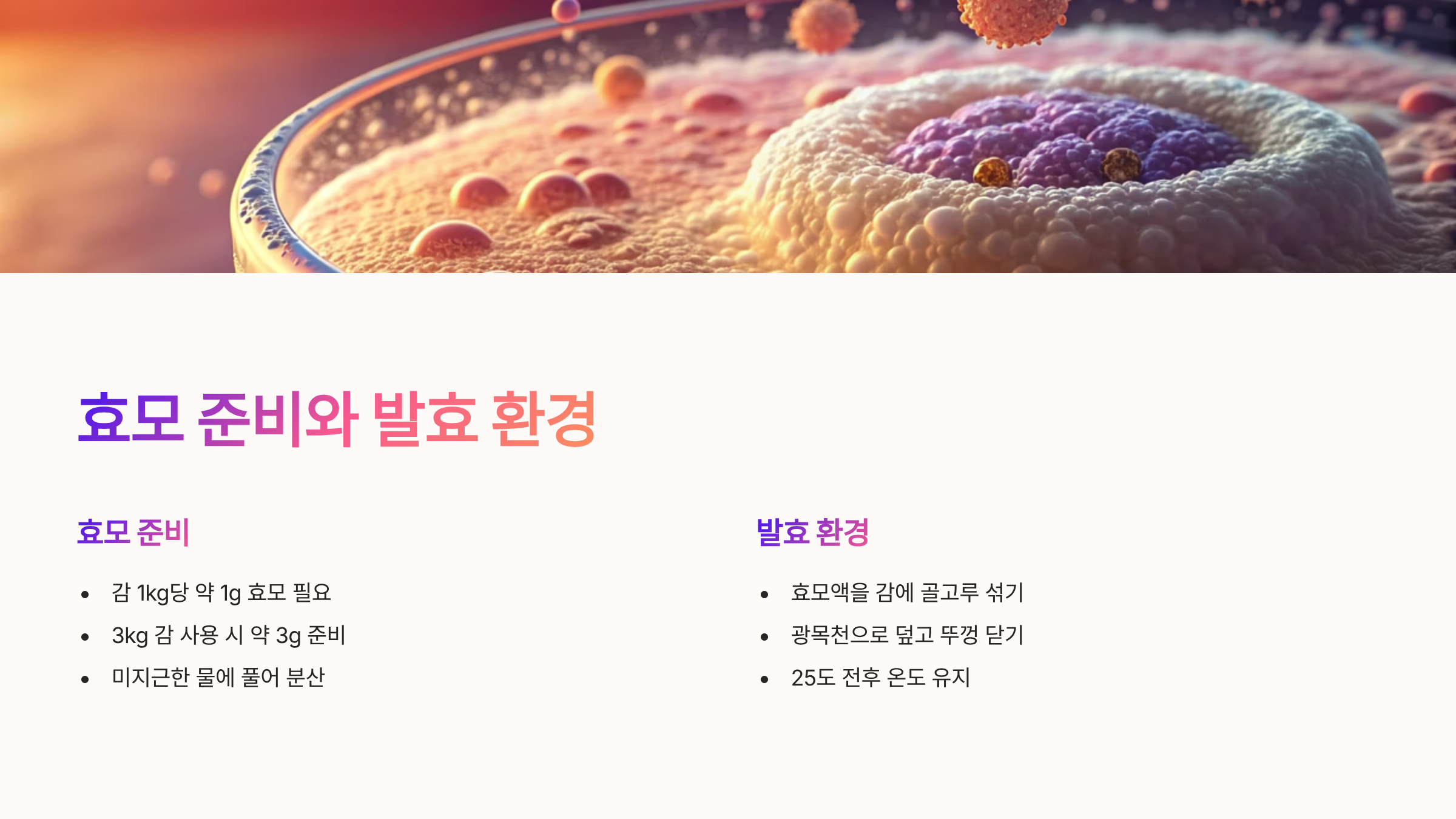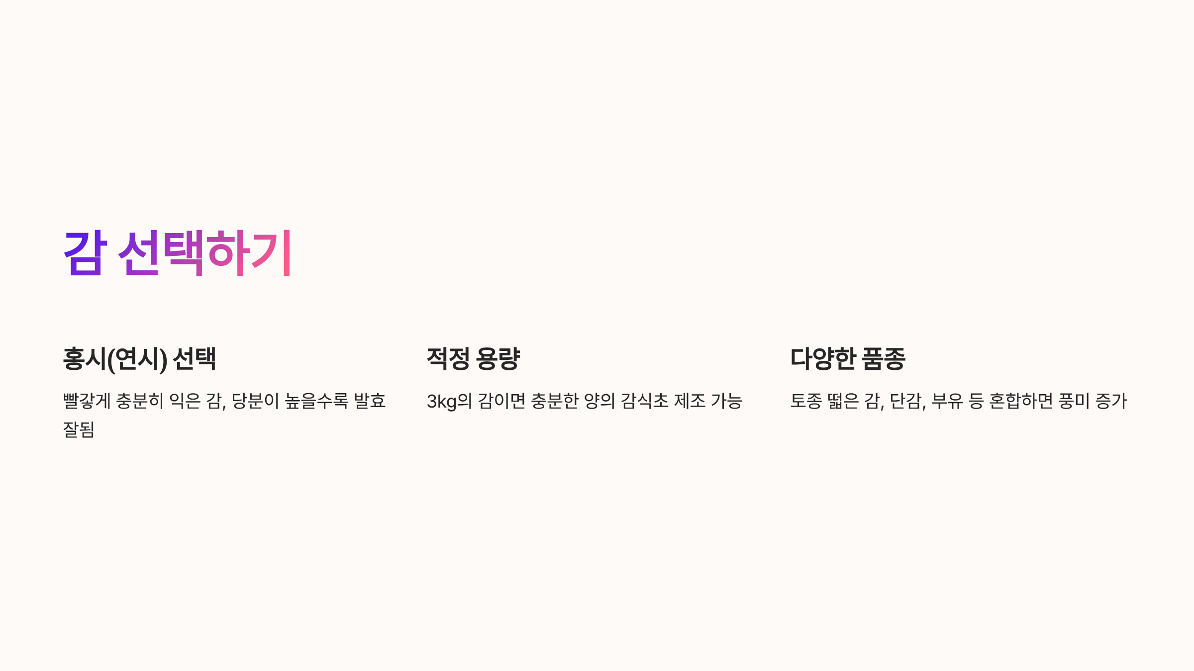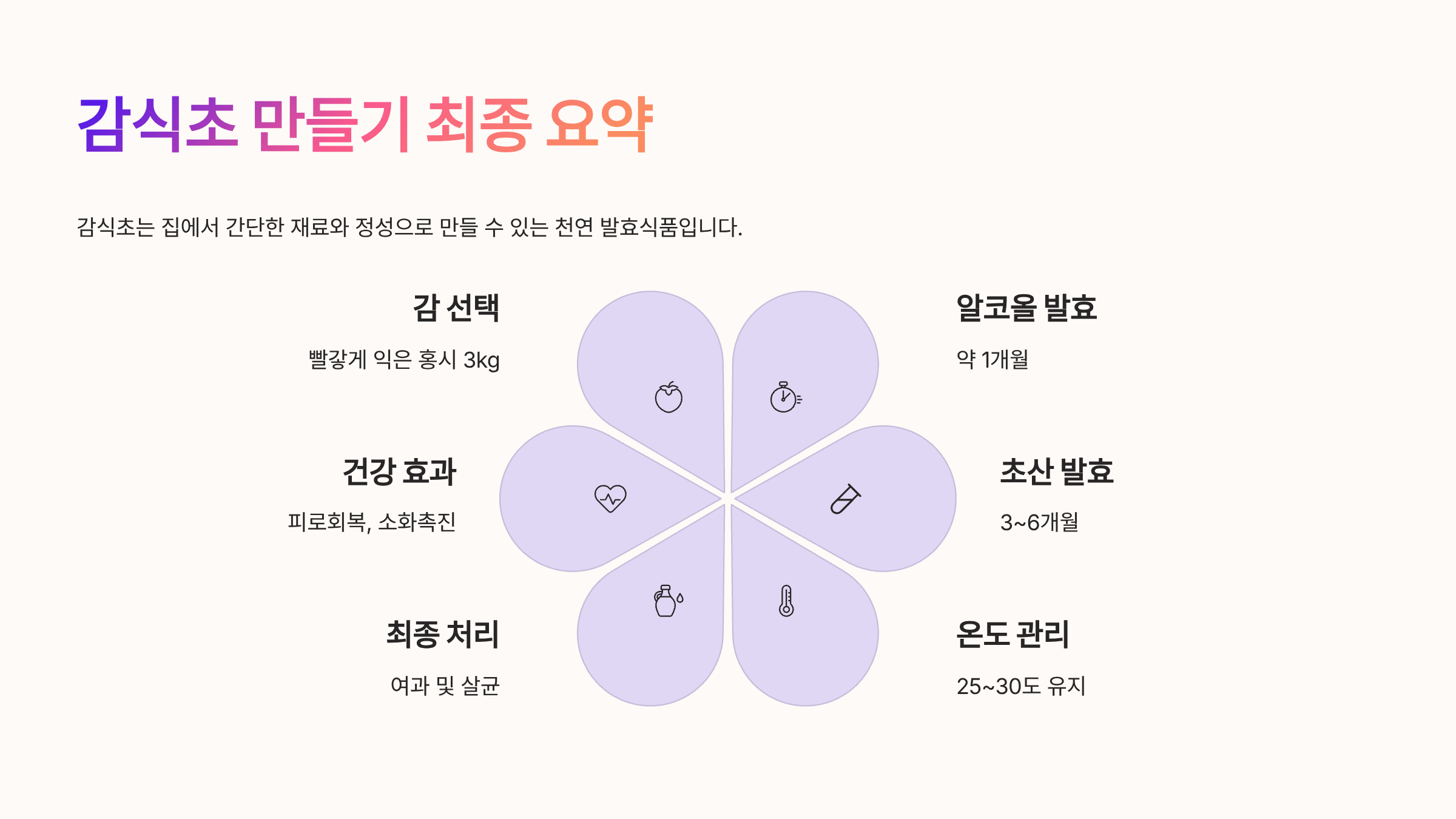 - 발효 온도, 용기 소독, 감의 당분이 감식초의 품질을 좌우하는 핵심 요소