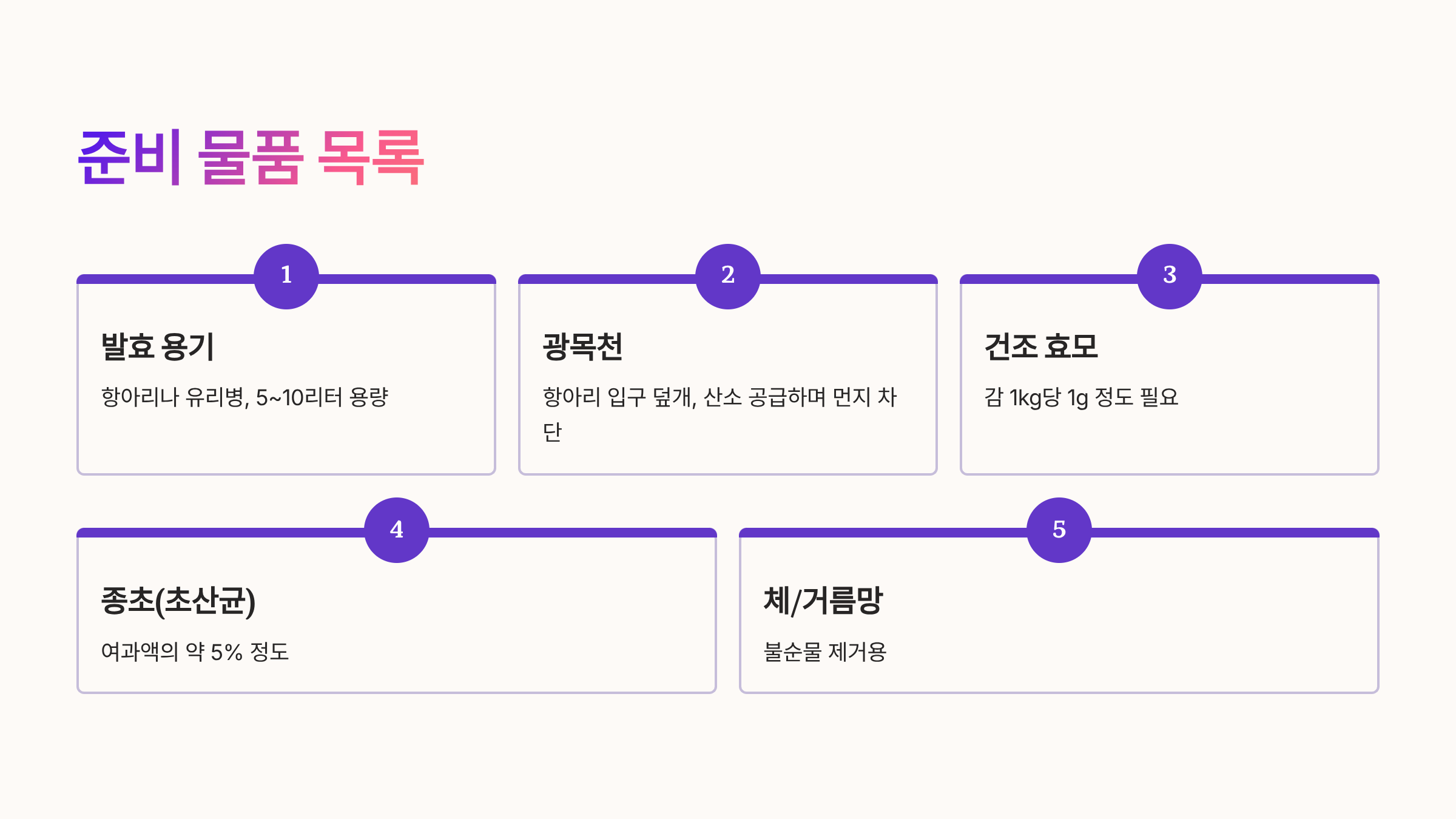 | 항아리 또는 유리병 | 5~10리터 | 발효 용기 |
