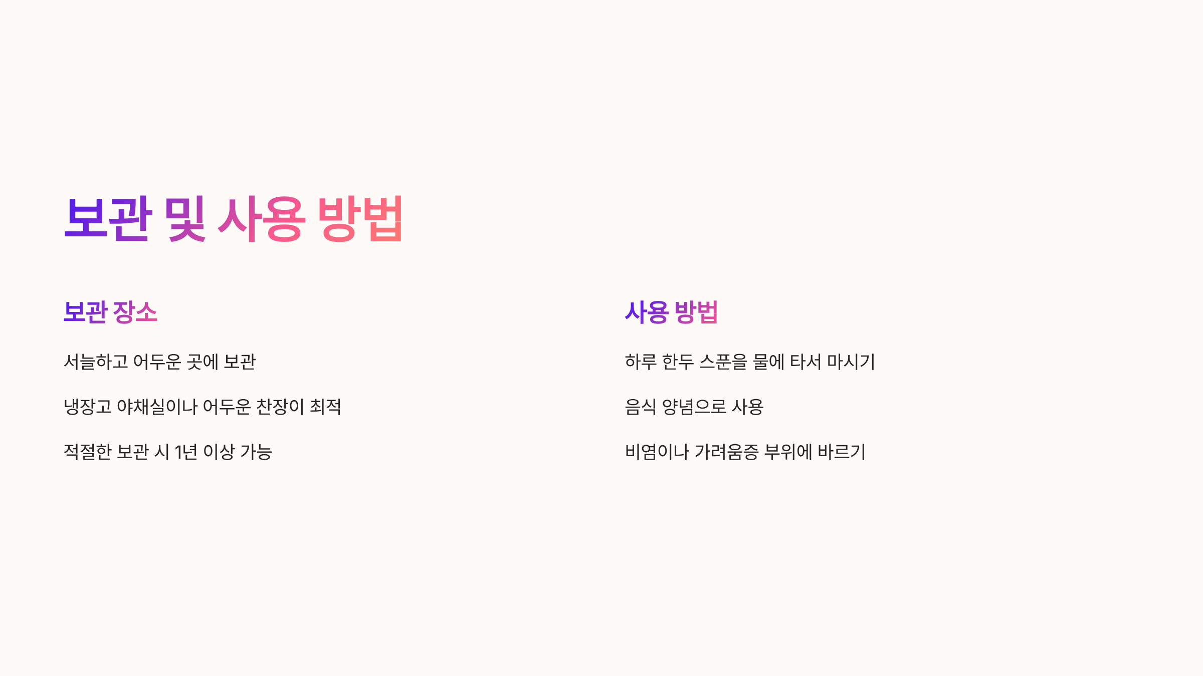 - 서늘하고 어두운 곳에 보관하며, 하루 1~2스푼을 물에 타서 마시면 건강에 좋음