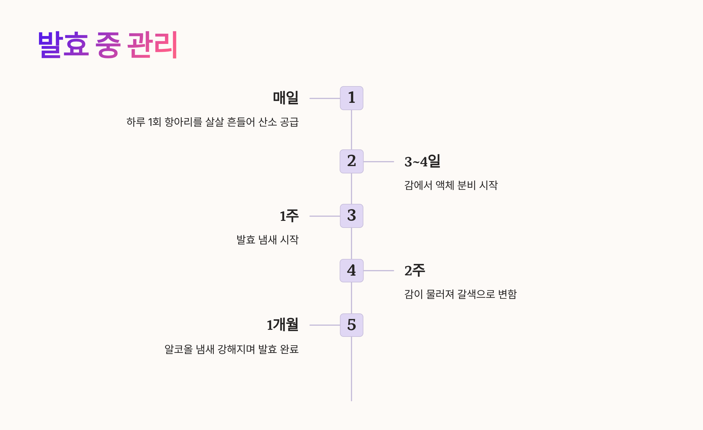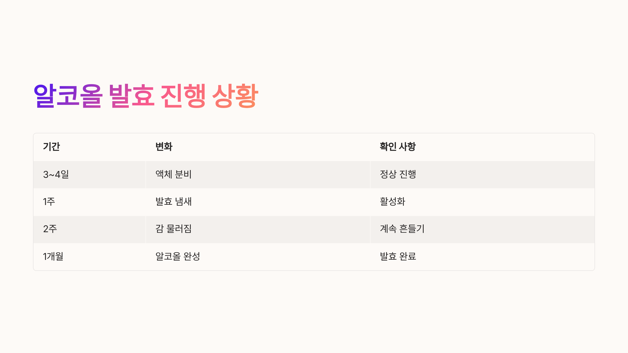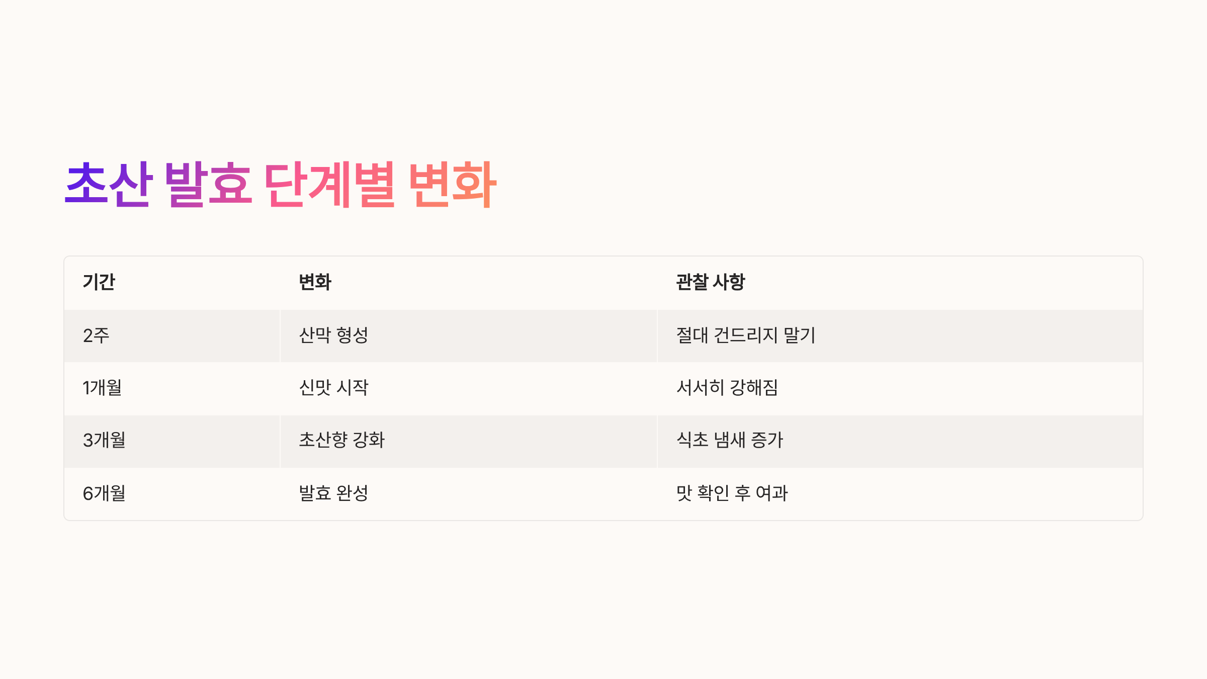 | 1개월 | 신맛 시작 | 서서히 강해짐 |