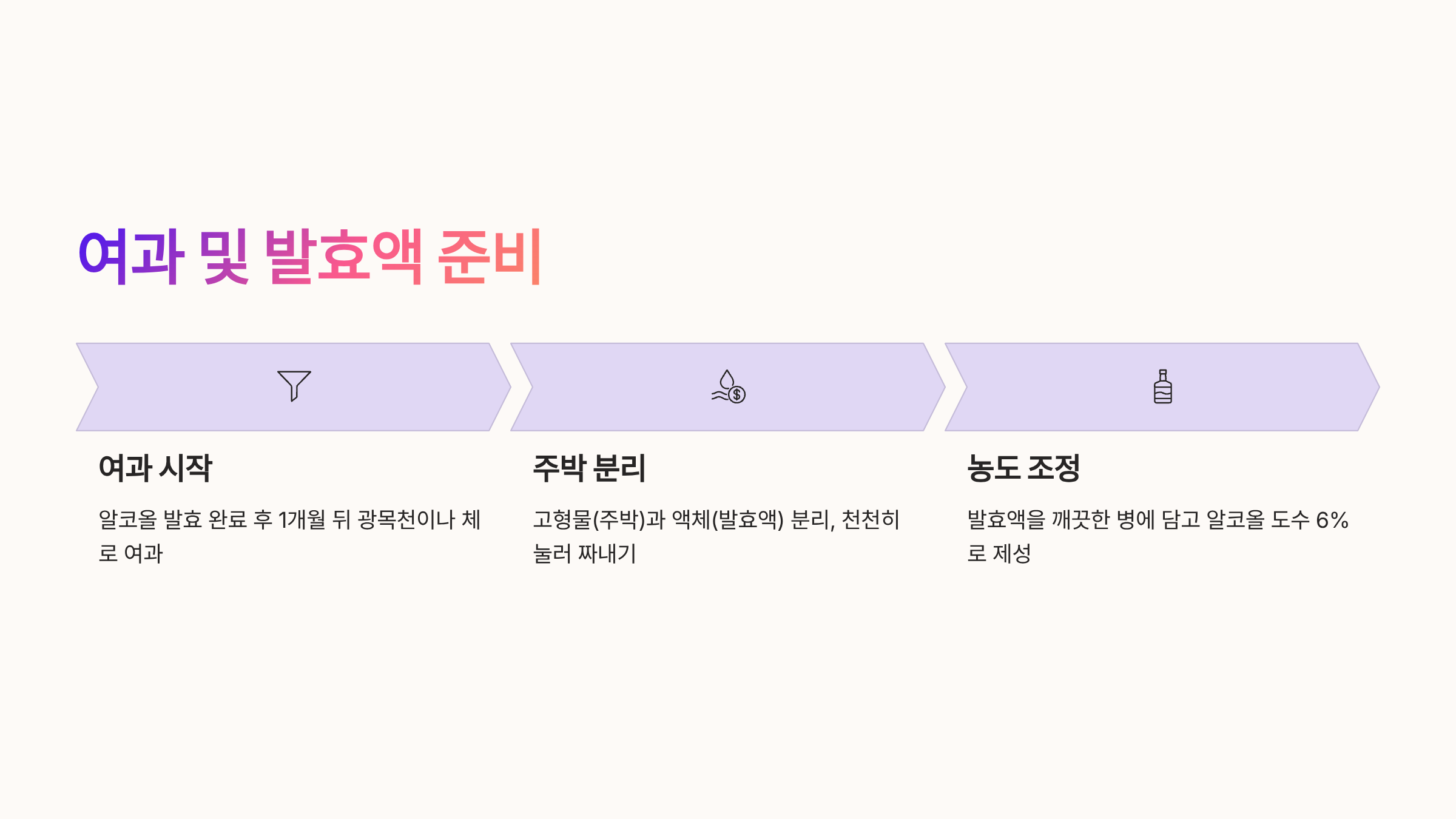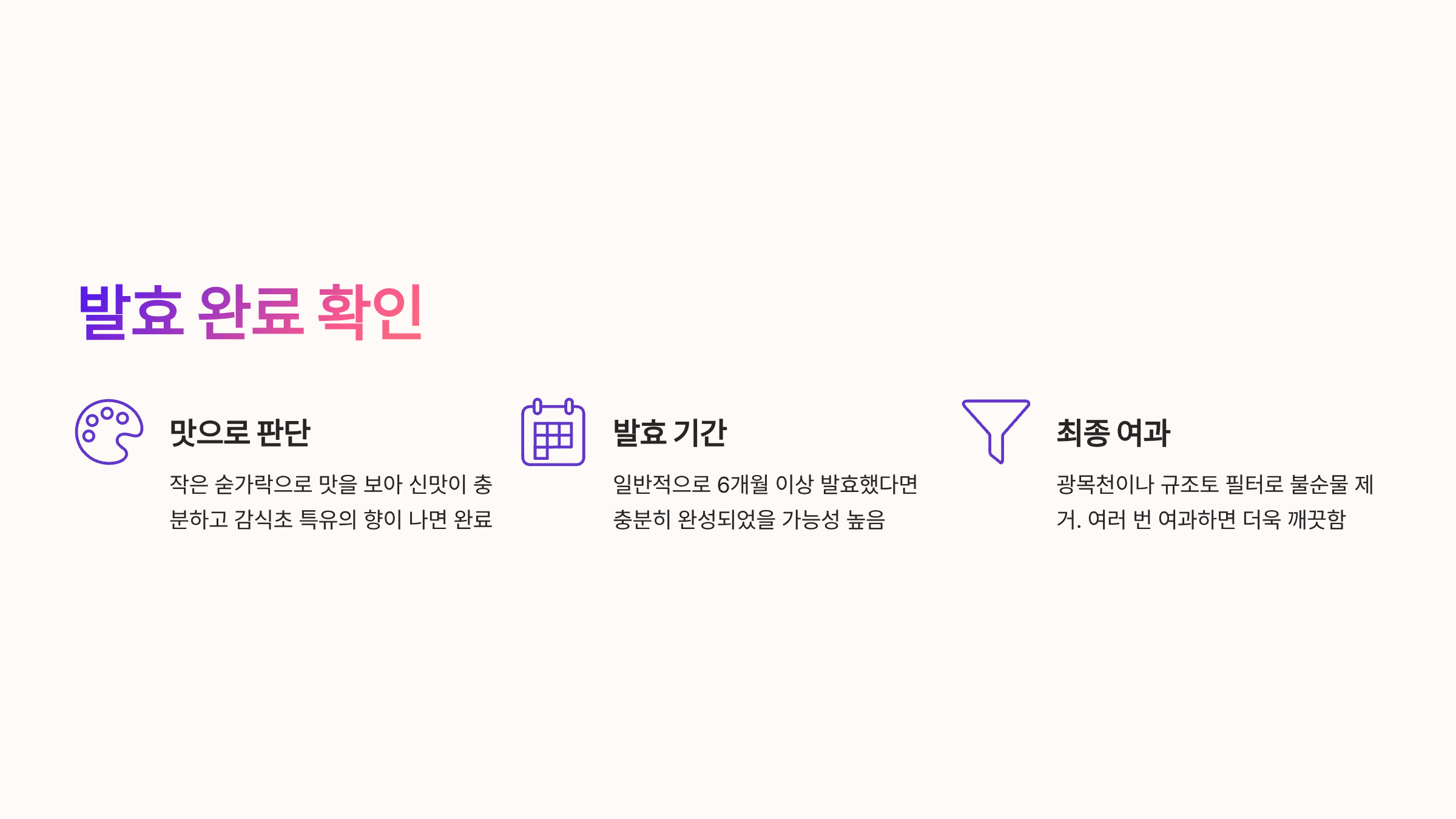 | 6개월 | 발효 완성 | 맛 확인 후 여과 |