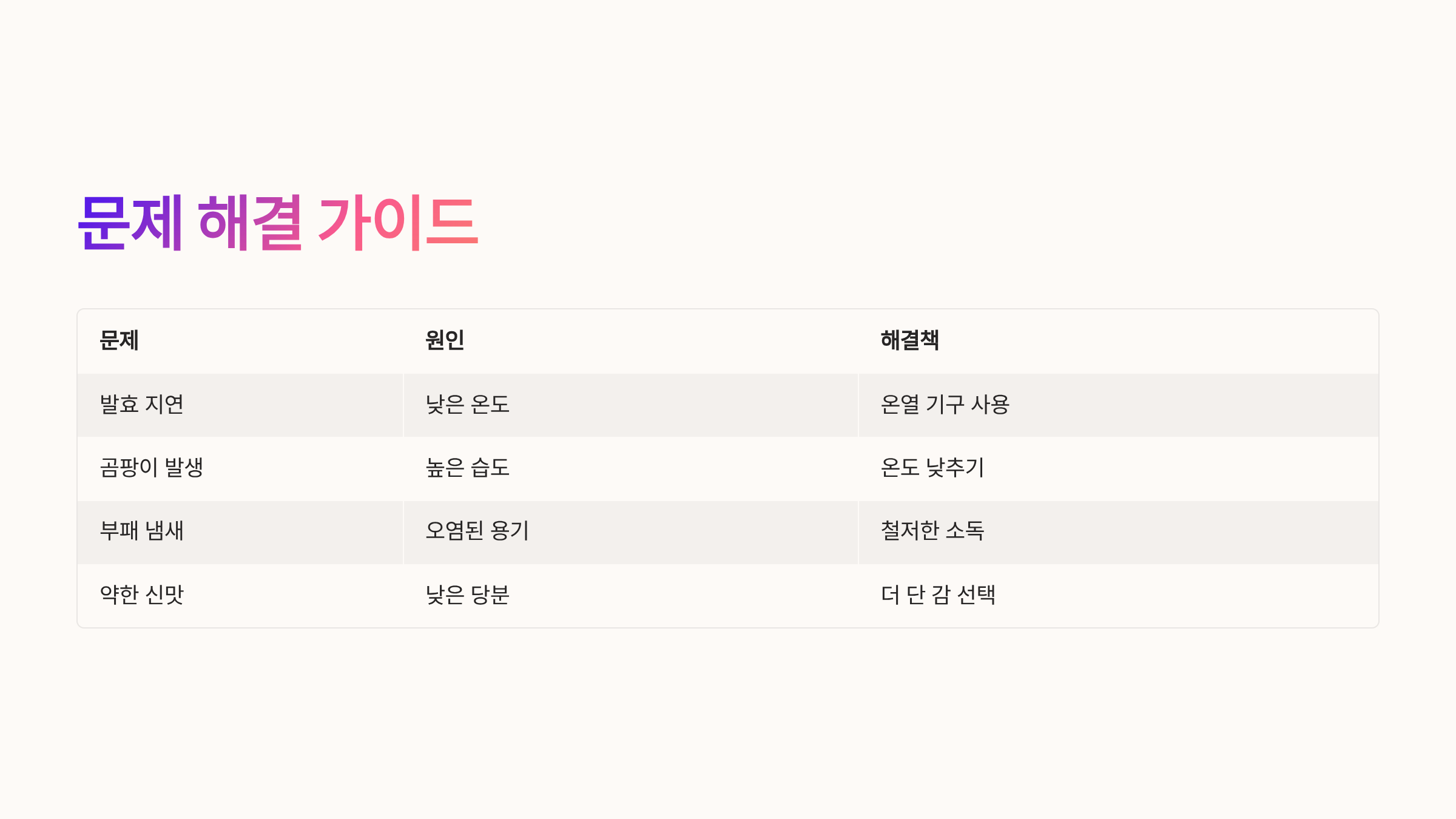 | 발효 지연 | 낮은 온도 | 온열 기구 사용 |