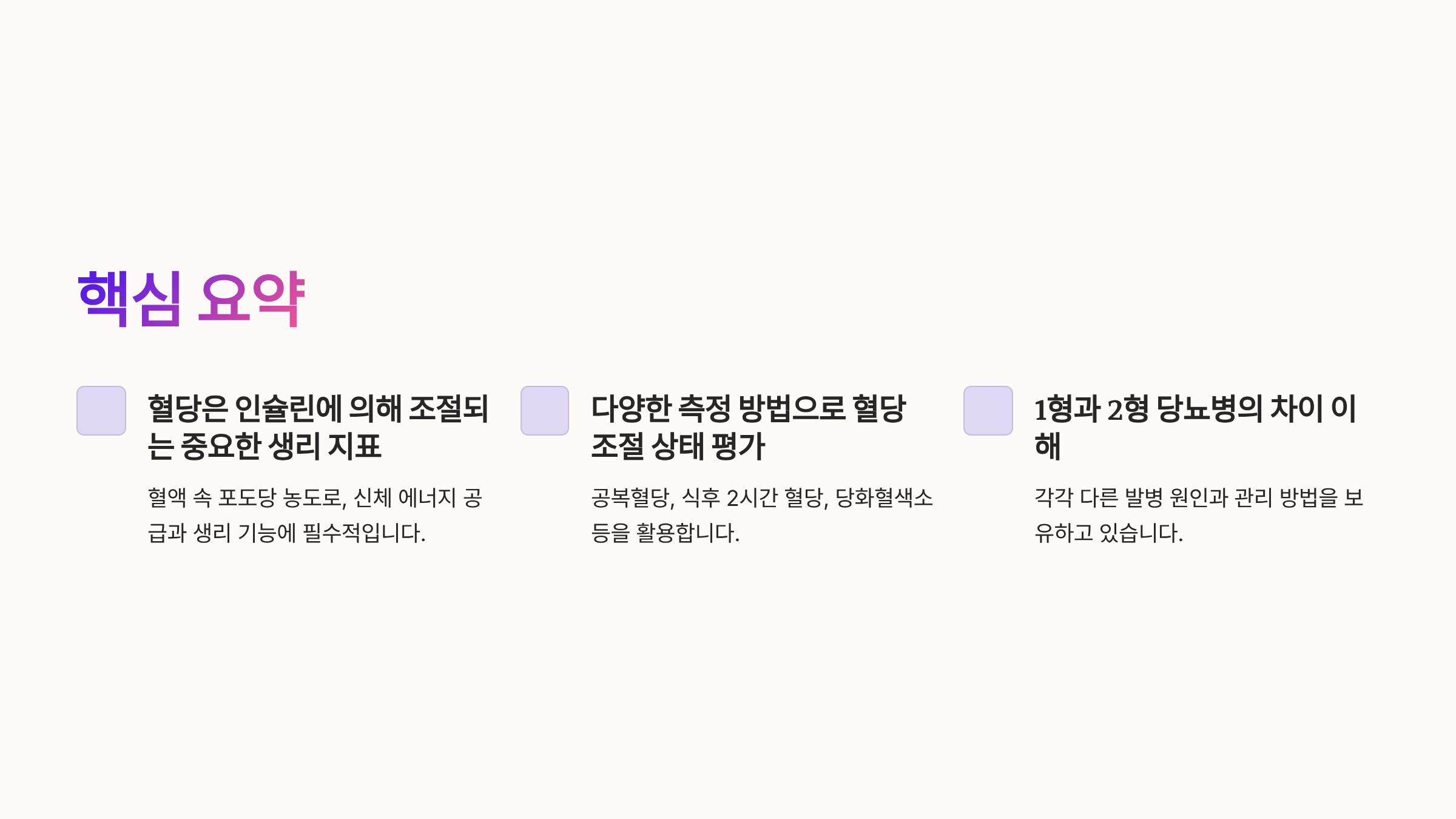 - 혈당은 혈액 속 포도당 농도로, 인슐린에 의해 조절되는 중요한 생리 지표