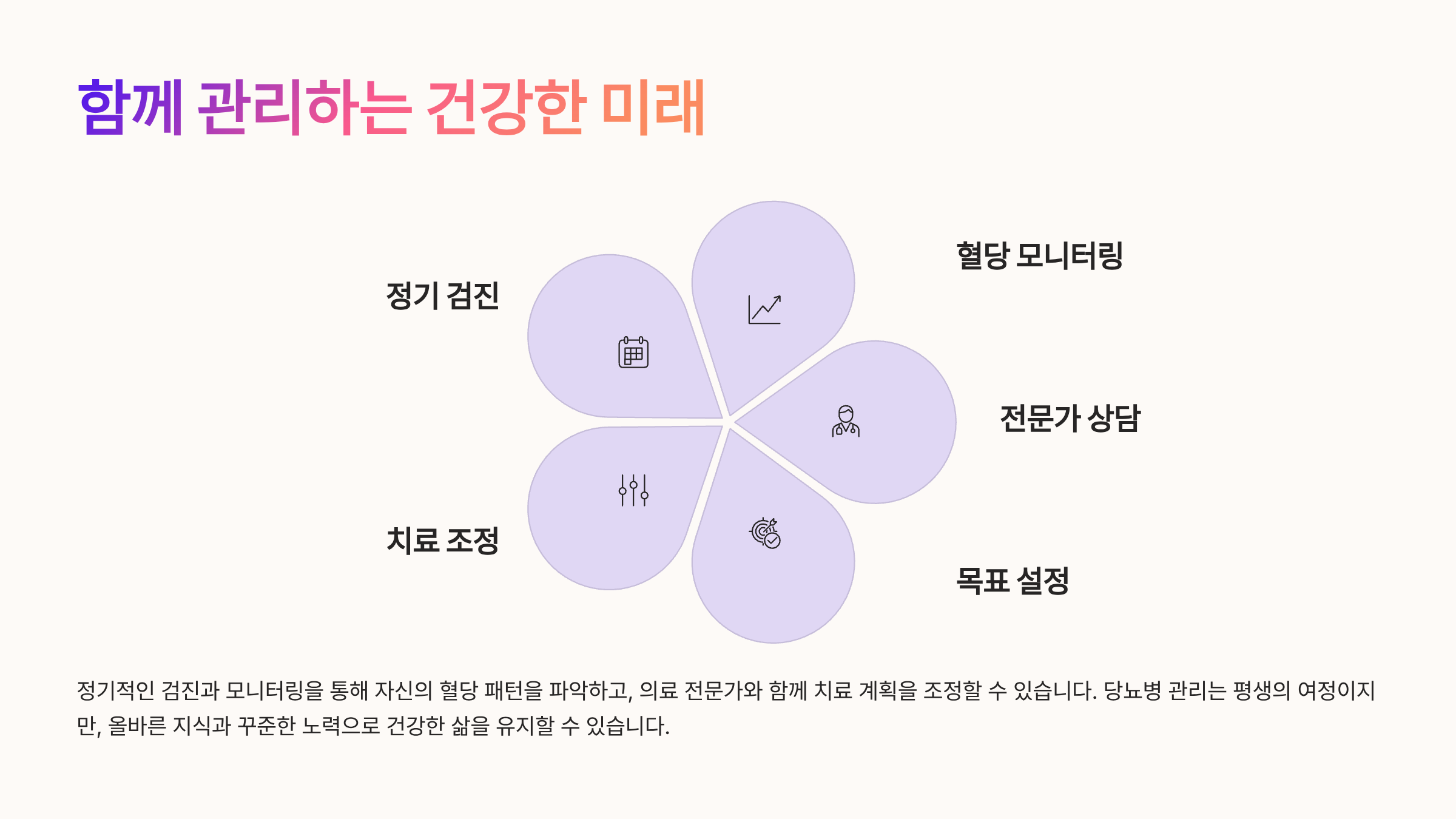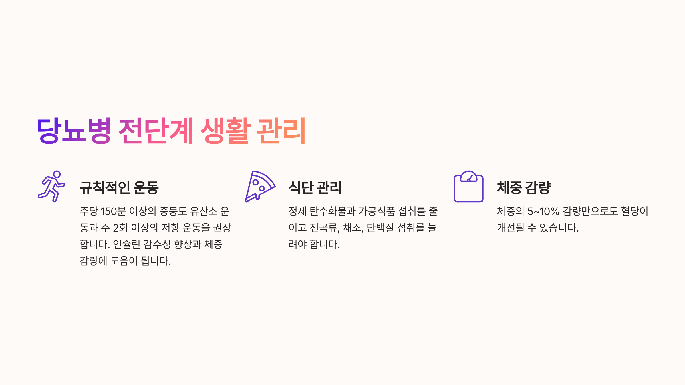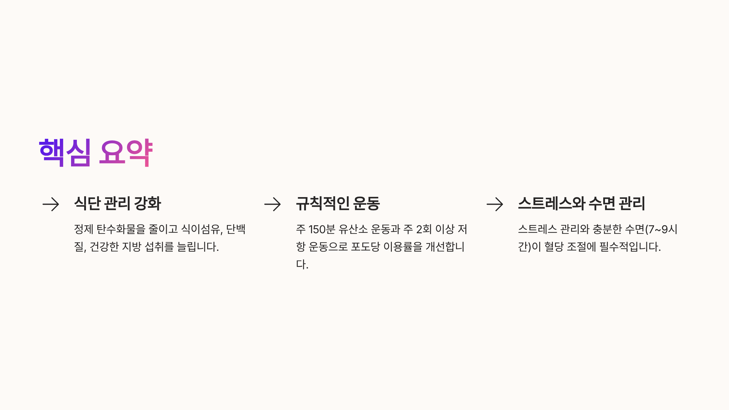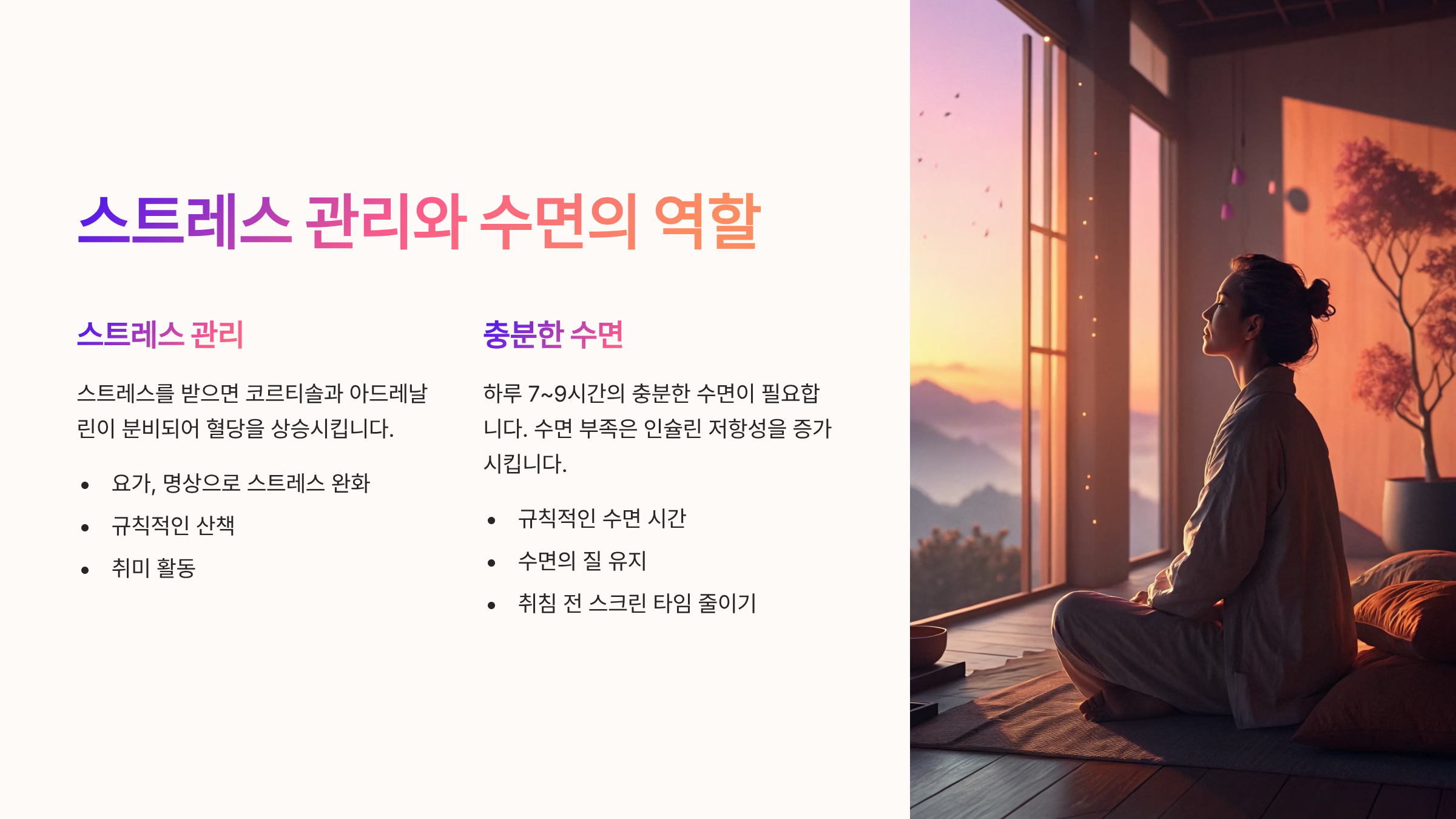 - 스트레스 관리와 충분한 수면(7~9시간)이 혈당 조절에 필수적