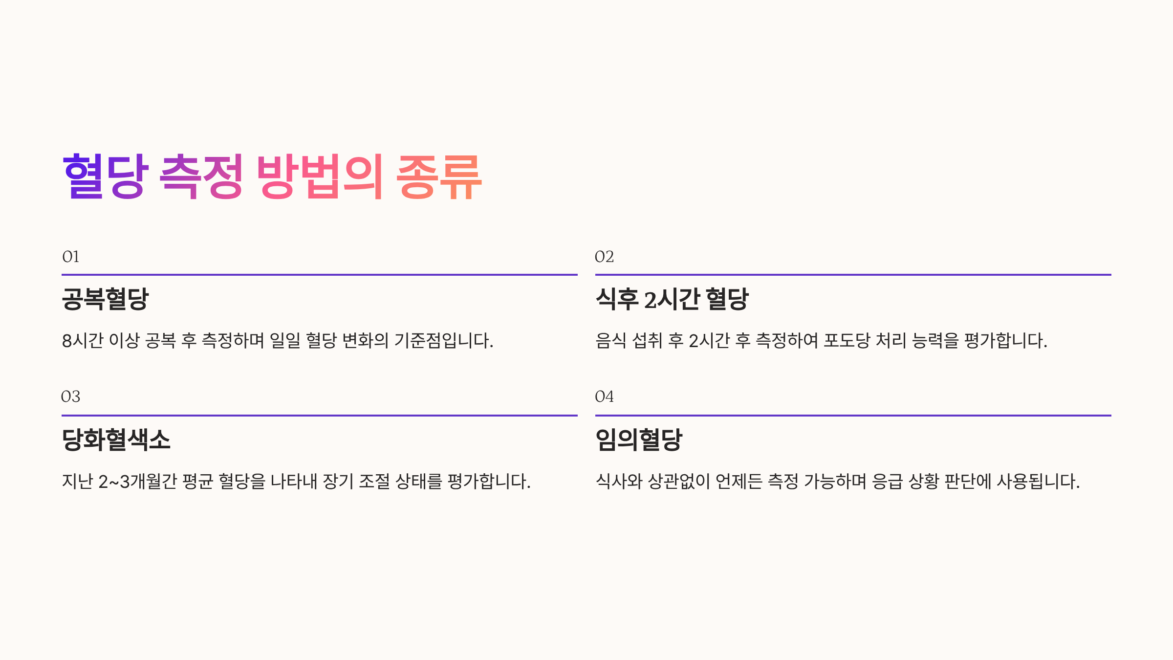 - 공복혈당, 식후 2시간 혈당, 당화혈색소 등 여러 측정 방법으로 혈당 조절 상태 평가