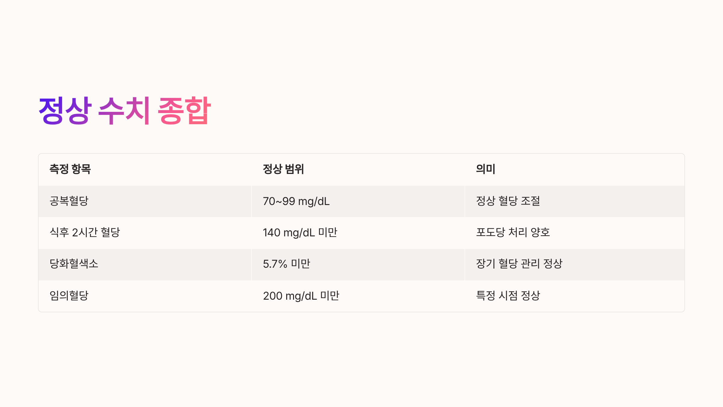| 당화혈색소 | 5.7% 미만 | 장기 혈당 관리 정상 |