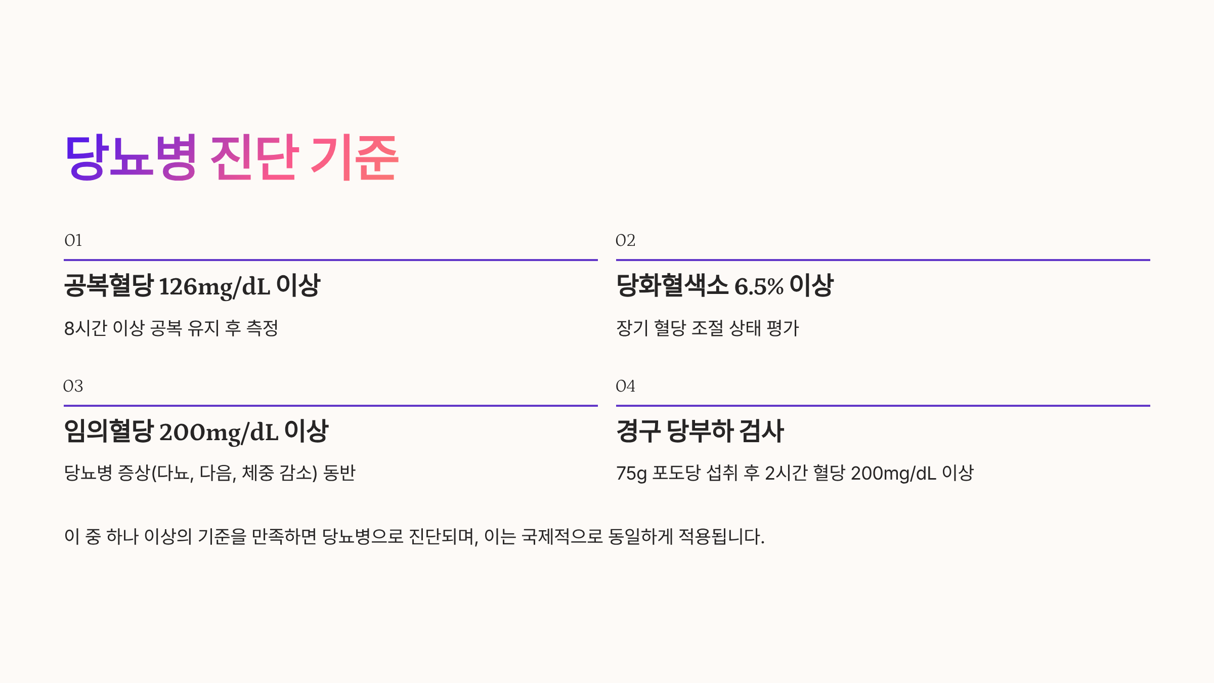 당뇨병으로 진단되려면 다음 중 하나 이상의 기준을 만족해야 합니다. 첫째, 8시간 이상 공복을 유지한 후 측정한 공복혈당이 126mg/dL 이상이어야 합니다. 둘째, 당화혈색소가 6.5% 이상이어야 합니다. 셋째, 임의 혈당이 200mg/dL 이상이고 당뇨병의 증상(다뇨, 다음, 체중 감소)이 있어야 합니다. 넷째, 경구 당부하 검사에서 75g 포도당 섭취 후 2시간 혈당이 200mg/dL 이상이어야 합니다. 이러한 기준은 국제적으로도 동일하게 적용되고 있습니다.