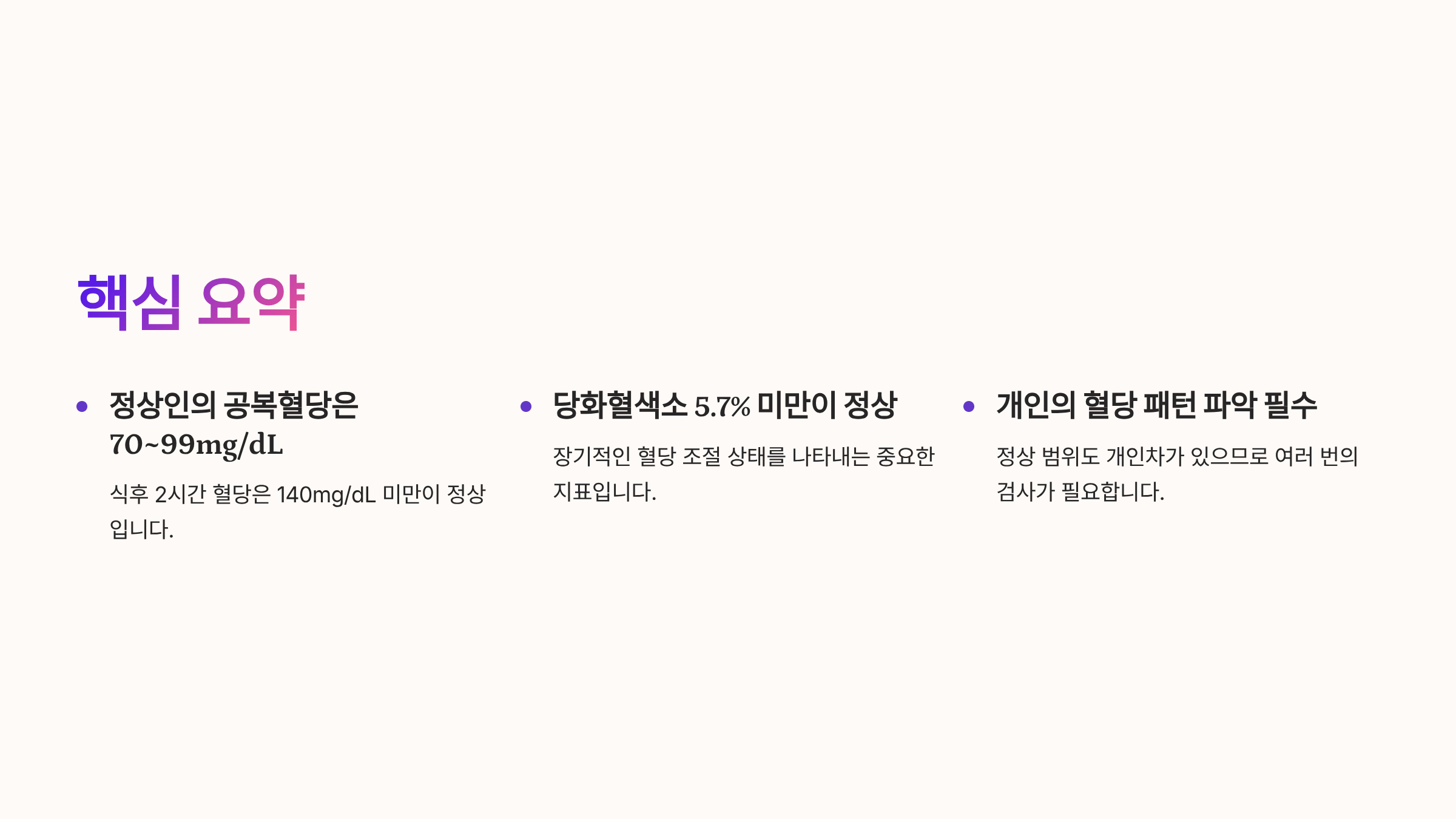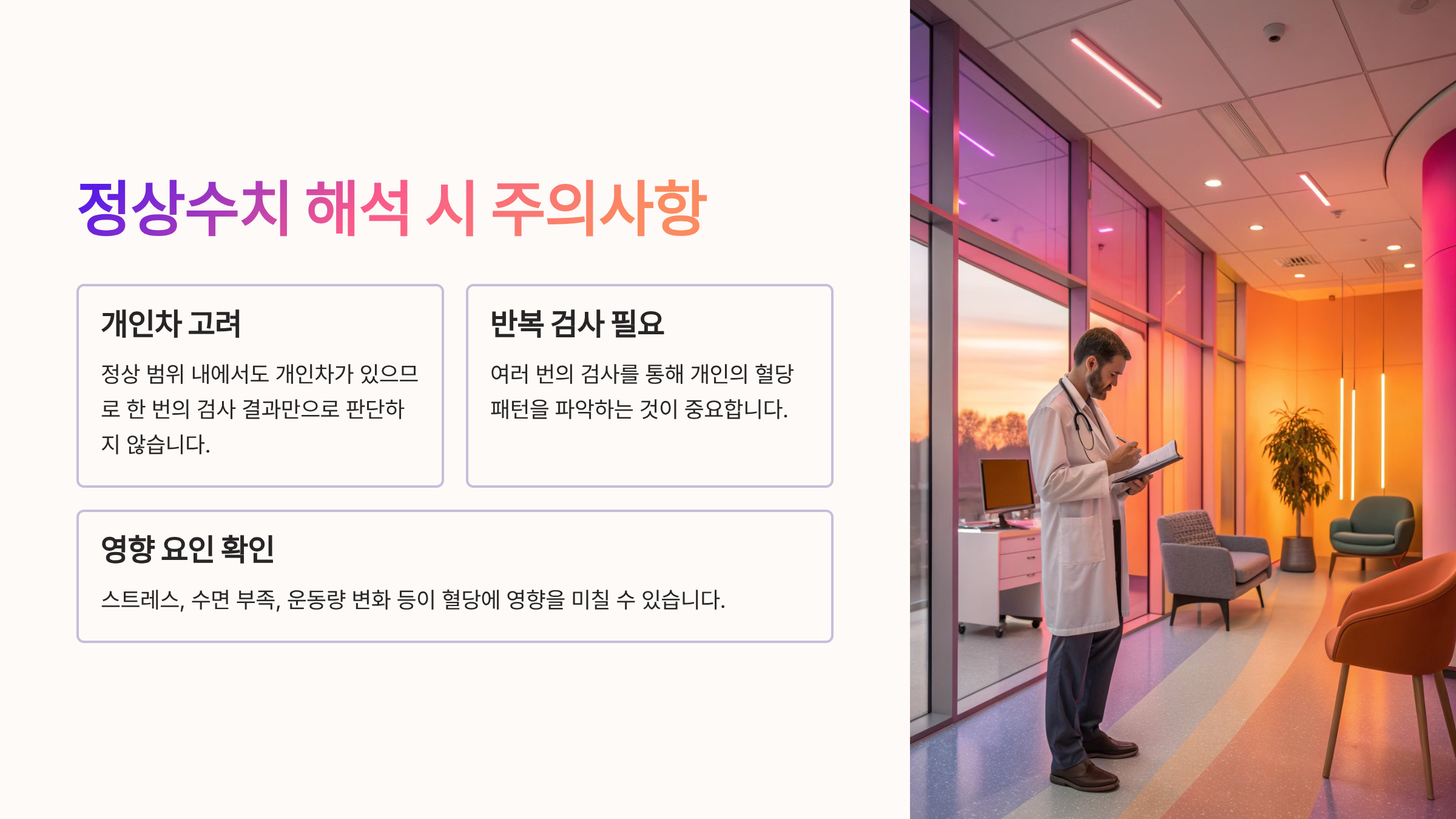 정상 범위 내의 수치도 개인차가 있을 수 있으므로, 한 번의 검사 결과만으로 판단해서는 안 됩니다. 여러 번의 검사를 통해 개인의 혈당 패턴을 파악하는 것이 중요합니다. 또한 스트레스, 수면 부족, 운동량 변화 등은 혈당에 영향을 미칠 수 있으므로 고려해야 합니다.