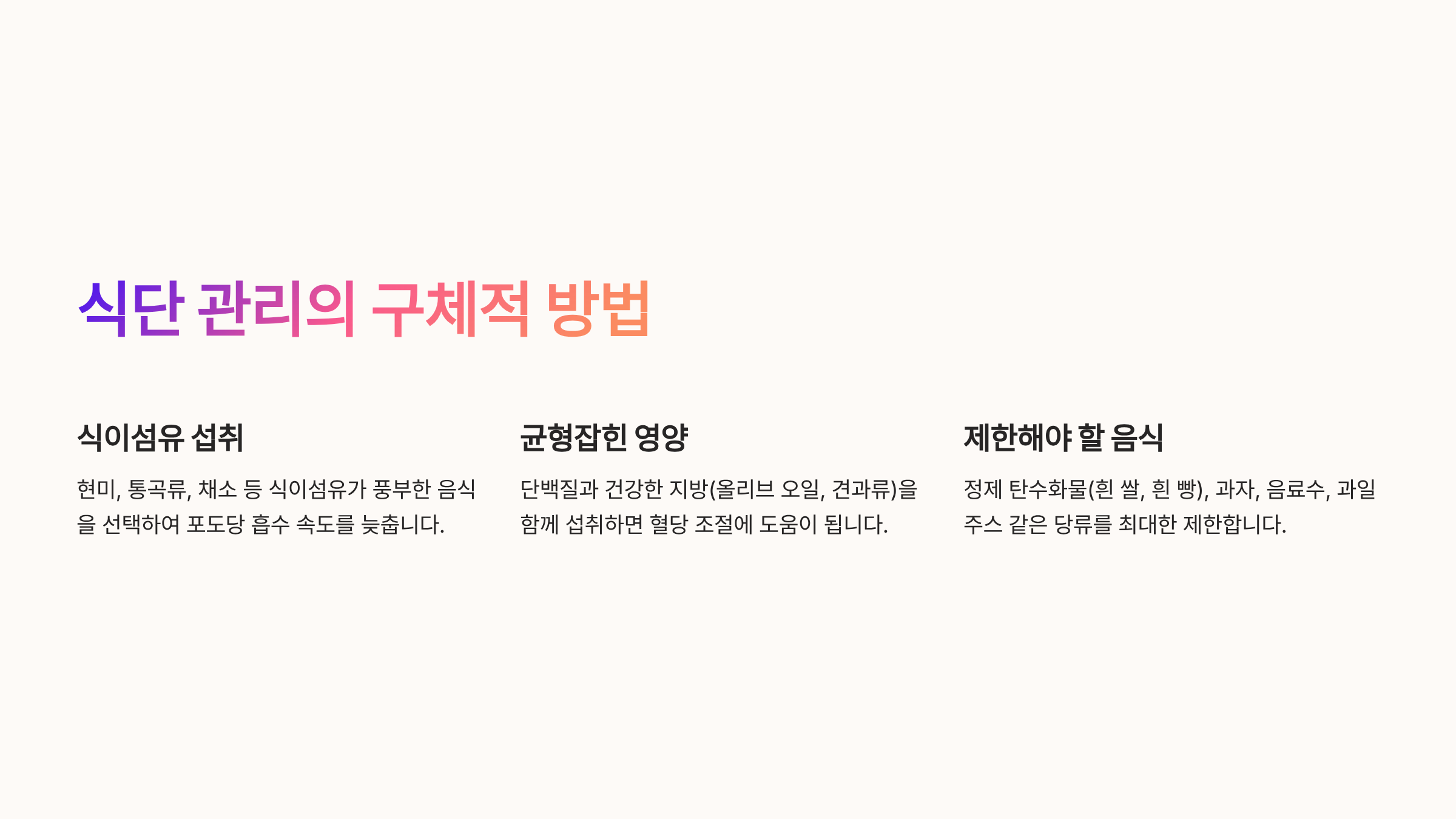 - 식단 관리에서는 정제 탄수화물을 줄이고 식이섬유, 단백질, 건강한 지방 섭취 강화