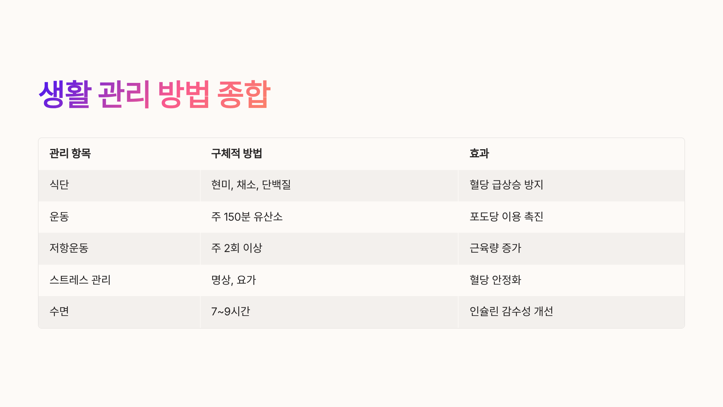 | 식단 | 현미, 채소, 단백질 | 혈당 급상승 방지 |