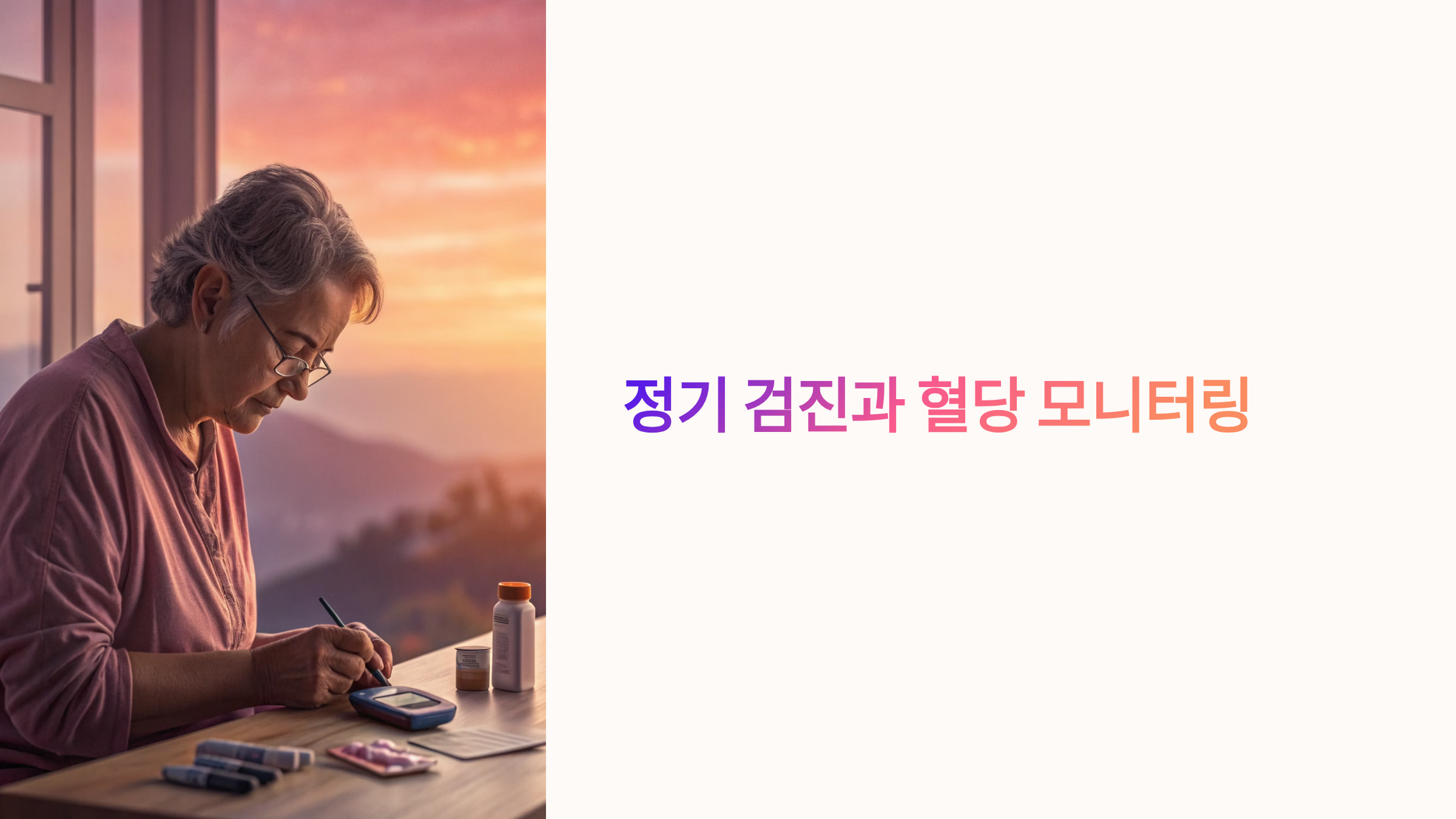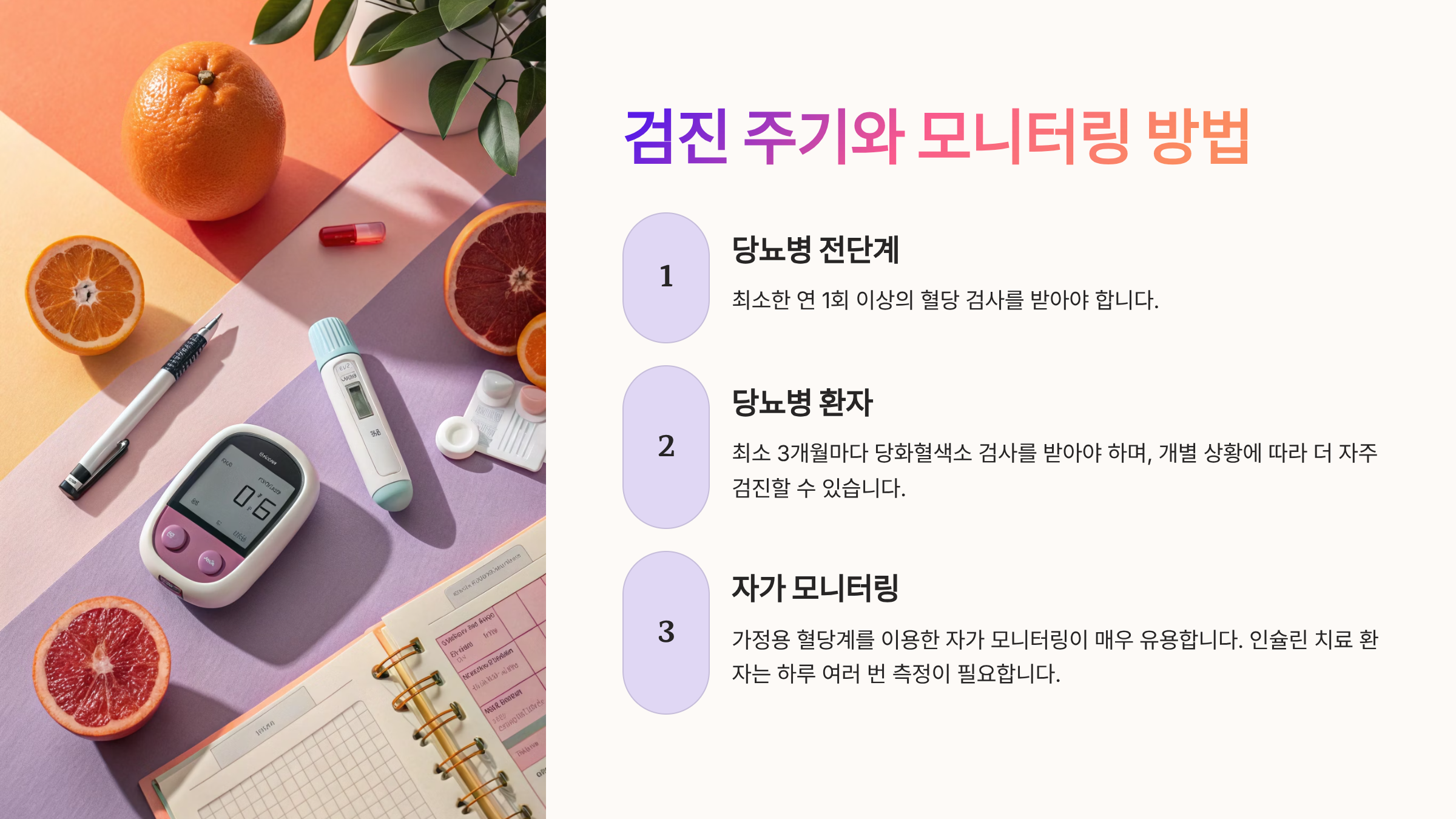 혈당은 시간에 따라 변하므로 정기적인 검진이 필수입니다. 당뇨병 전단계 진단자는 최소한 연 1회 이상의 혈당 검사를 받아야 합니다. 당뇨병 환자는 최소 3개월마다 당화혈색소 검사를 받아야 하며, 개별 상황에 따라 더 자주 검진할 수 있습니다. 가정용 혈당계를 이용한 자가 모니터링도 매우 유용합니다. 특히 인슐린 치료를 받는 환자는 하루 여러 번의 혈당 측정이 필요합니다. 정기적인 검진과 모니터링을 통해 자신의 혈당 패턴을 파악하고, 의료 전문가와 함께 치료 계획을 조정할 수 있습니다.