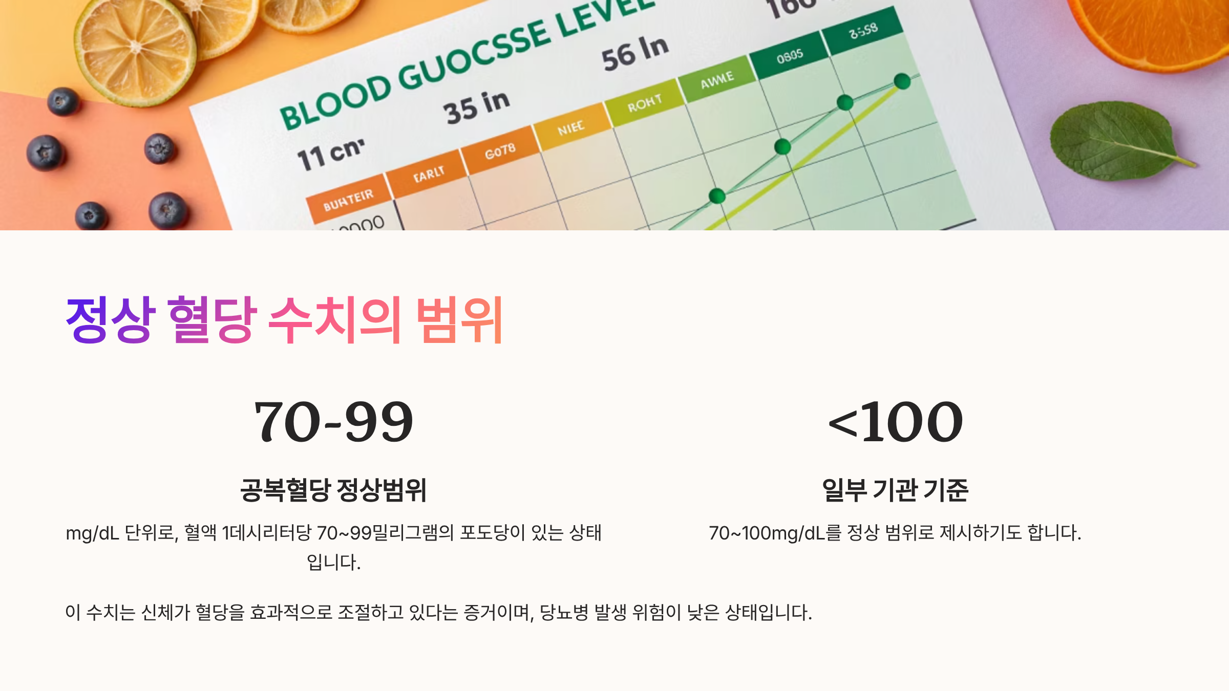 | 공복혈당 | 70~99 mg/dL | 정상 혈당 조절 |