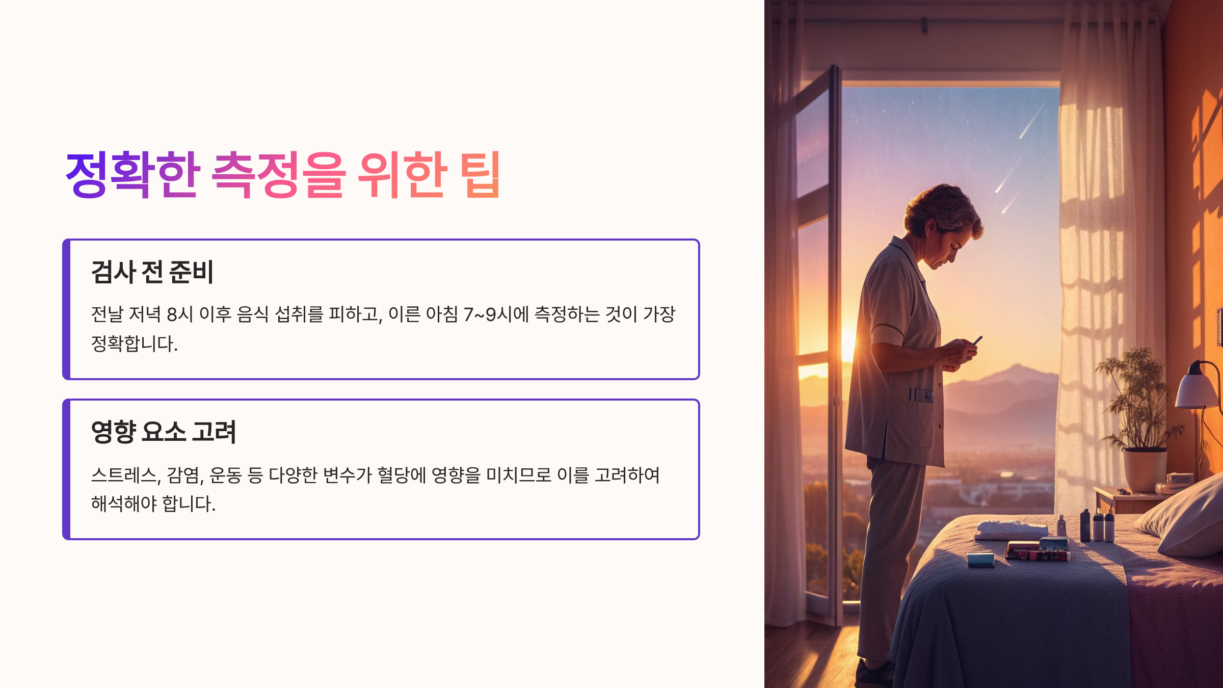 혈당을 정확하게 측정하려면 검사 전날 저녁 8시 이후 음식 섭취를 피해야 합니다. 공복혈당은 이른 아침, 일반적으로 오전 7~9시에 측정하는 것이 가장 정확합니다. 또한 스트레스, 감염, 운동 등 다양한 요소가 혈당에 영향을 미치므로, 이러한 변수를 고려하여 해석해야 합니다.