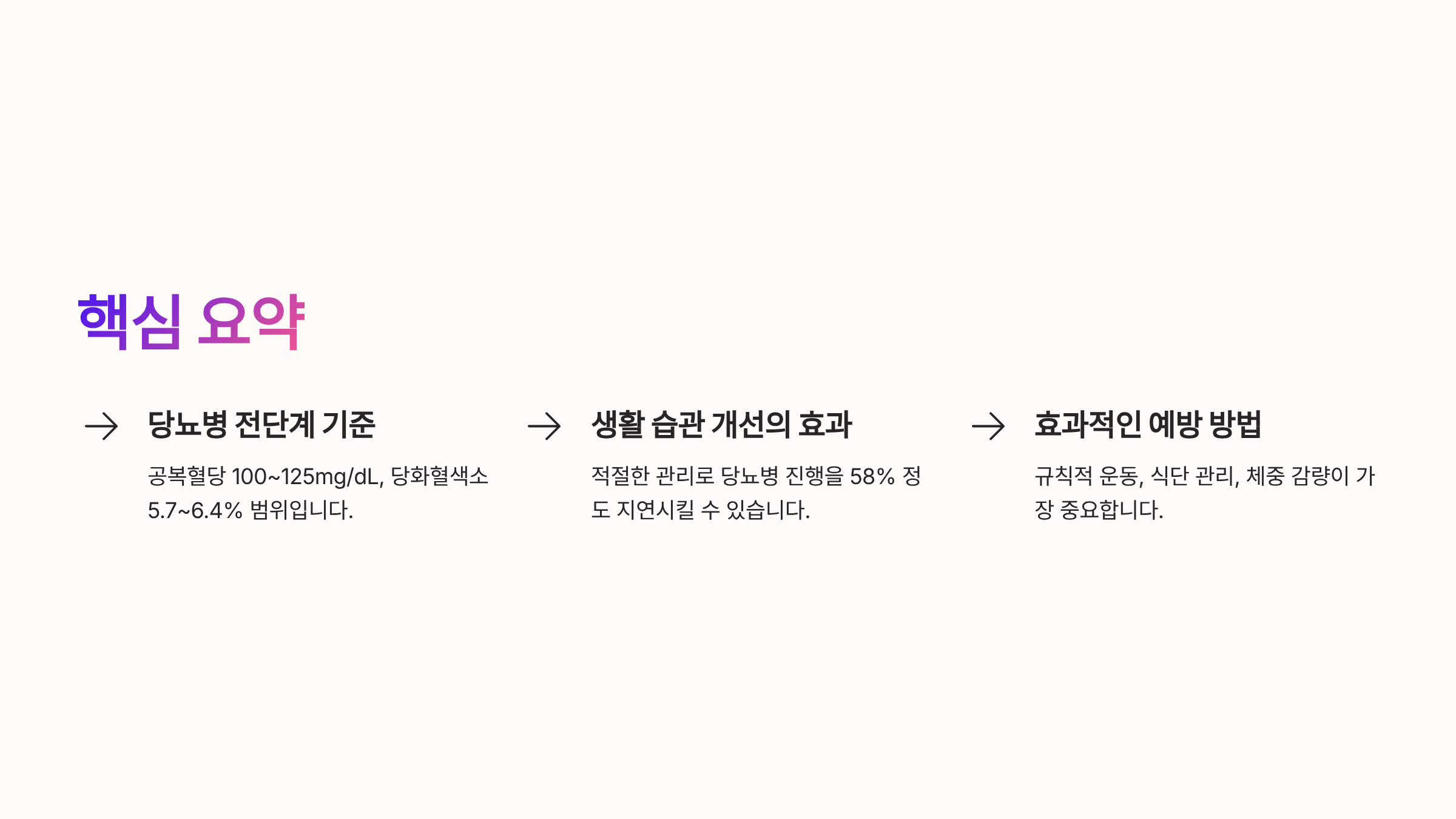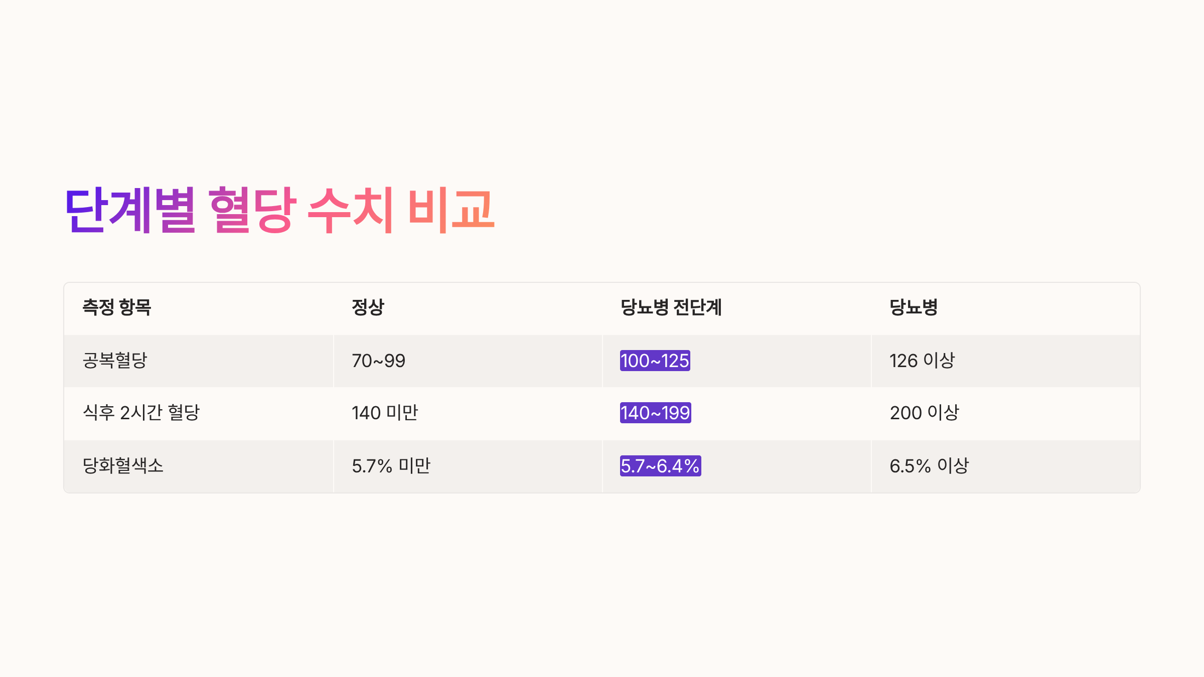 - 당뇨병 전단계는 공복혈당 100~125mg/dL, 당화혈색소 5.7~6.4% 범위