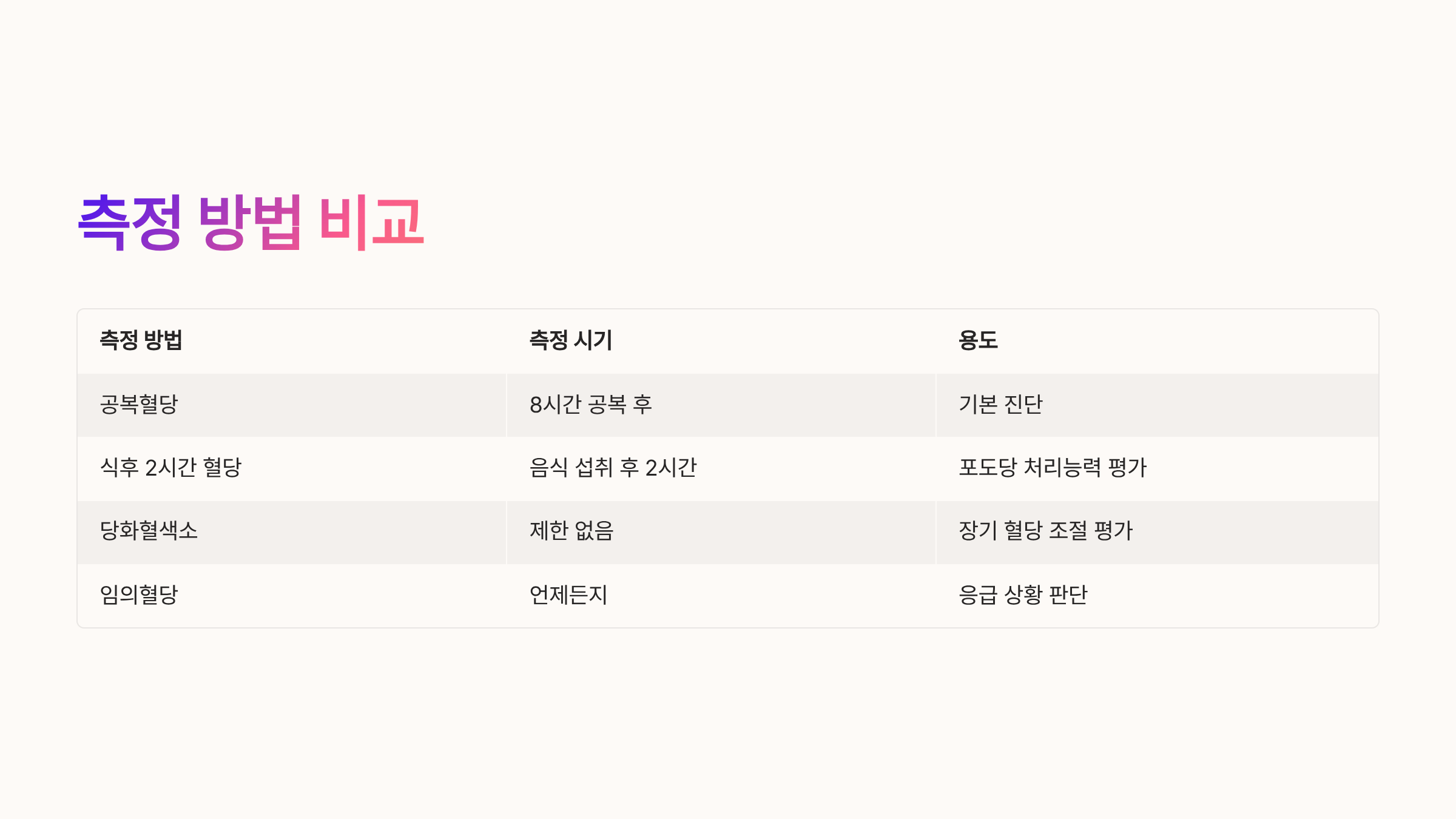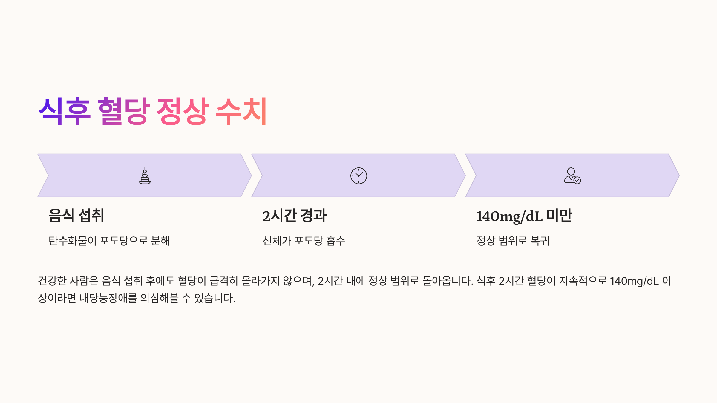 | 식후 2시간 혈당 | 음식 섭취 후 2시간 | 포도당 처리능력 평가 |
