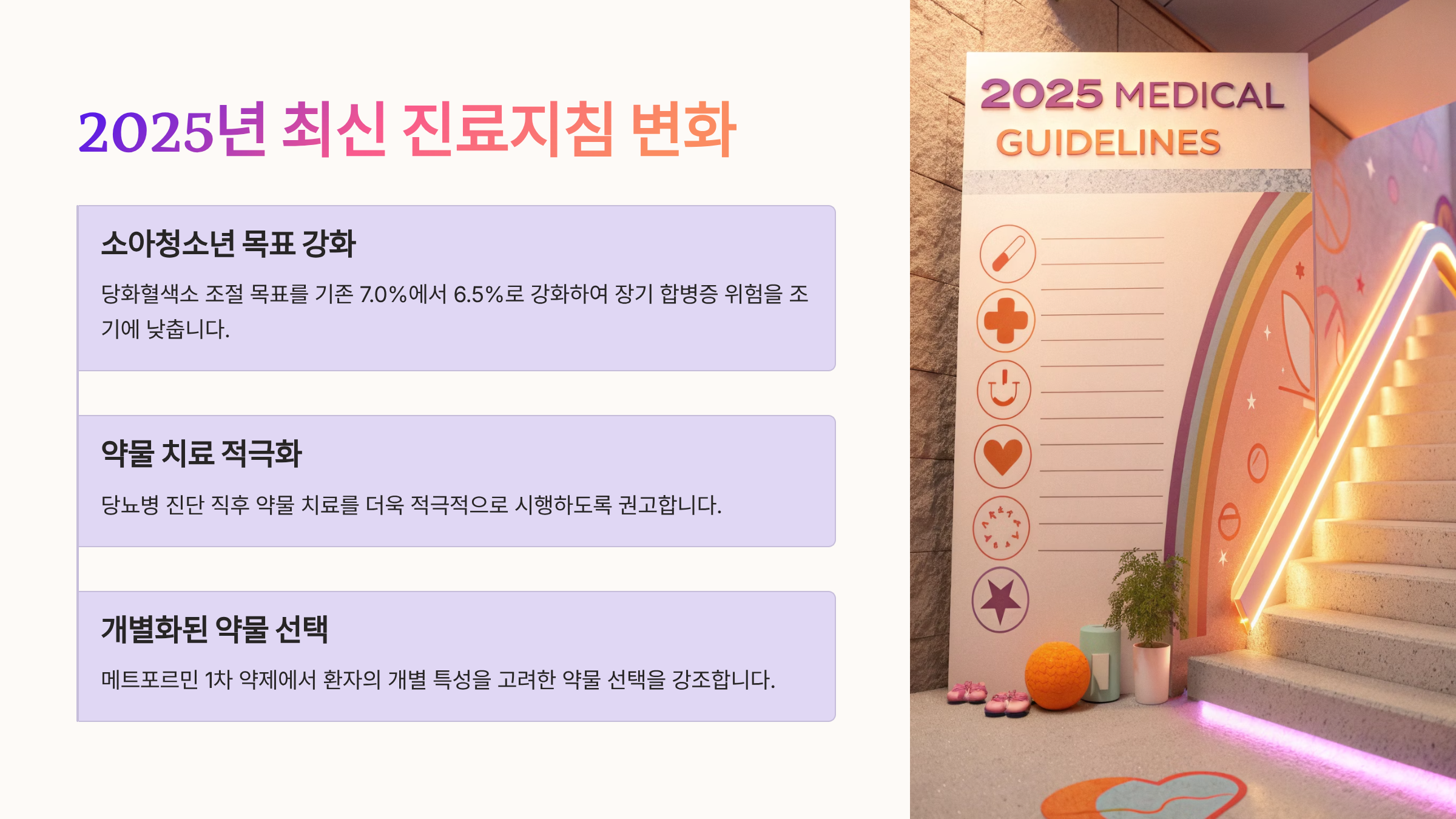 2025년 대한당뇨병학회에서 발표한 새로운 진료지침에는 몇 가지 중요한 변화가 있습니다. 가장 주목할 점은 소아청소년 환자의 당화혈색소 조절 목표를 기존 7.0%에서 6.5%로 강화한 것입니다. 이는 장기간의 고혈당으로 인한 합병증 위험을 조기에 낮추기 위한 결정입니다. 또한 당뇨병 진단 직후 약물 치료를 더욱 적극적으로 시행하도록 권고하고 있습니다. 기존에 메트포르민을 1차 약제로 권고하던 것에서 환자의 개별 특성을 고려한 약물 선택을 강조하고 있습니다.