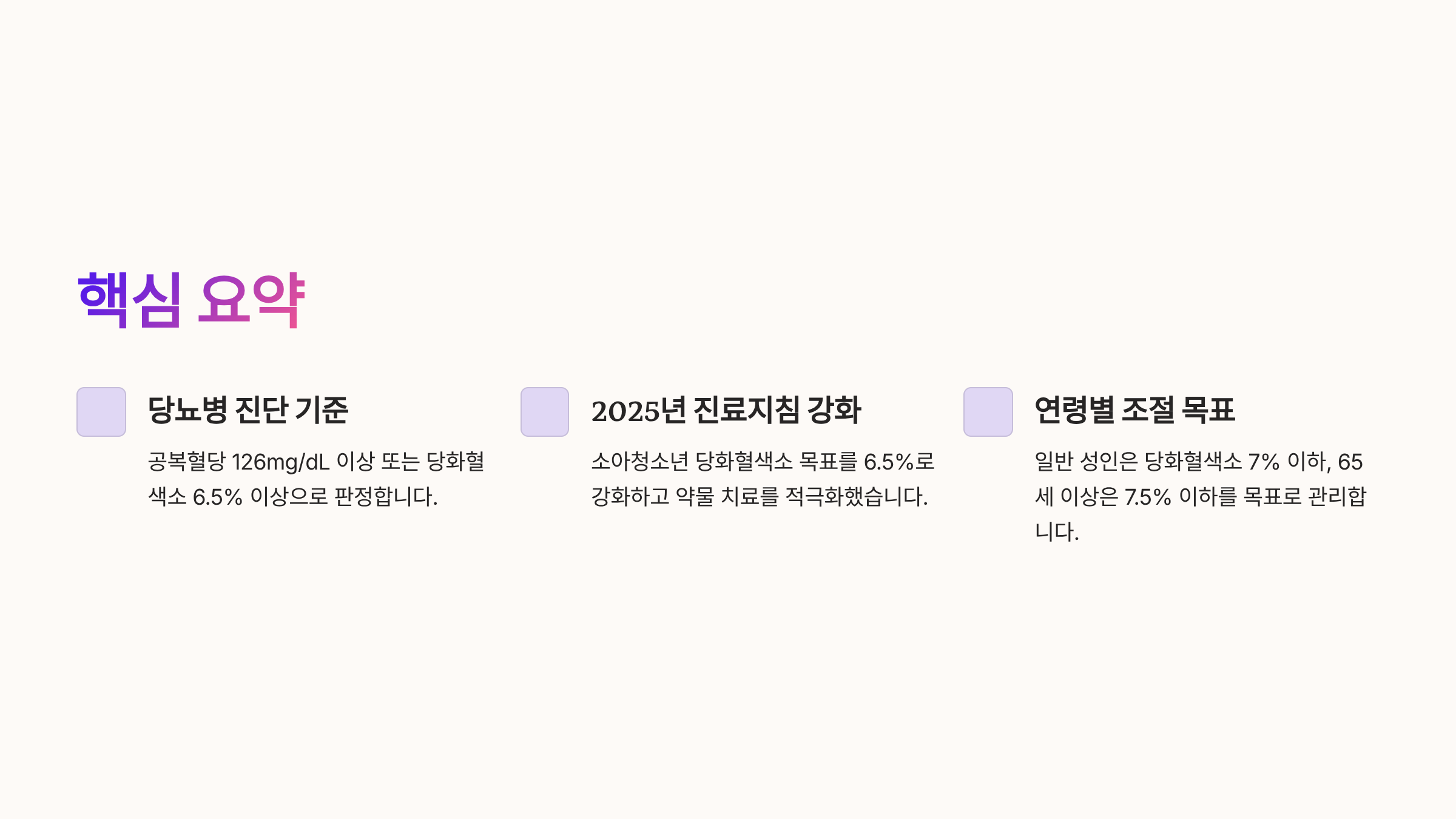 - 2025년 진료지침에서는 소아청소년 당화혈색소 목표를 6.5%로 강화하고 약물 치료 적극화