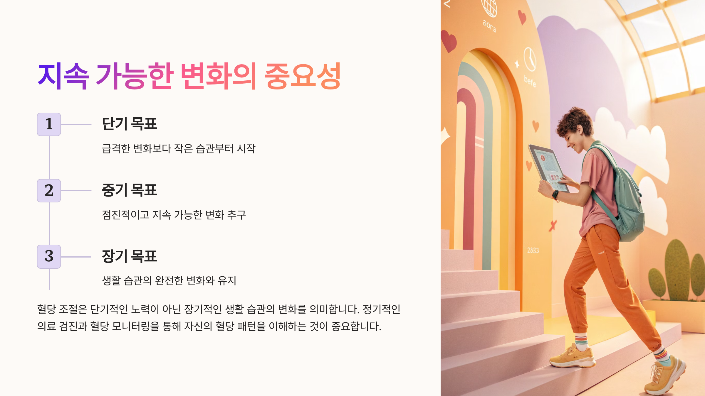 혈당 조절은 단기적인 노력이 아닌 장기적인 생활 습관의 변화를 의미합니다. 급격한 생활 방식의 변화보다는 점진적이고 지속 가능한 변화를 추구하는 것이 성공의 핵심입니다. 또한 정기적인 의료 검진과 혈당 모니터링을 통해 자신의 혈당 패턴을 이해하는 것이 중요합니다.