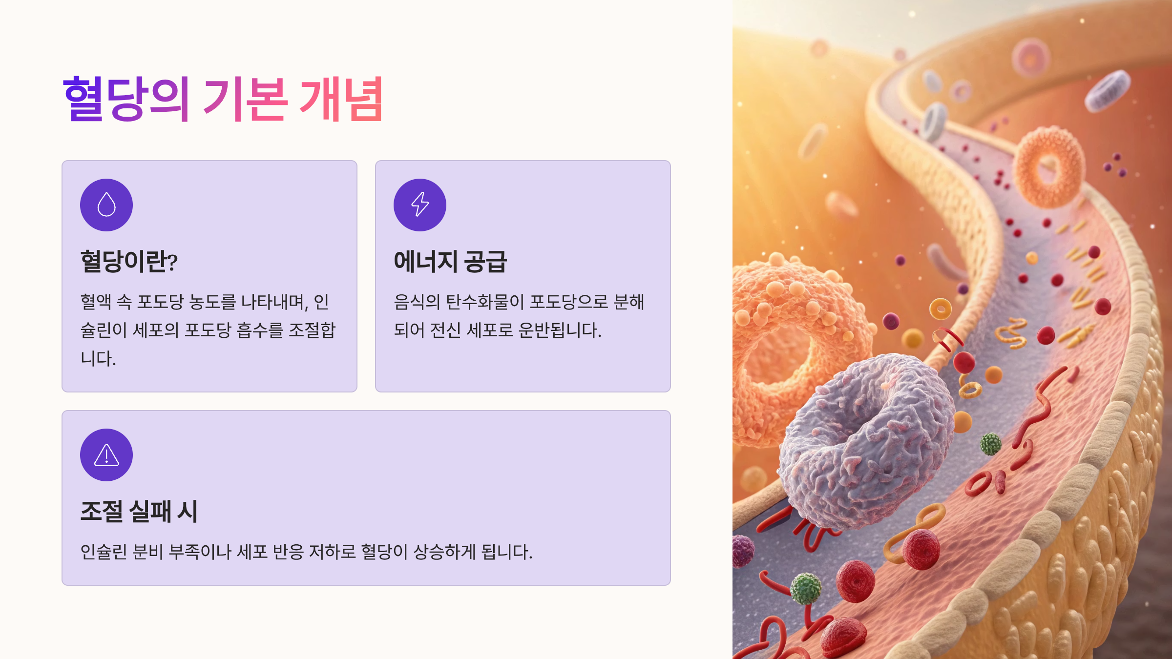 혈당은 혈액 속에 포함된 포도당의 농도를 나타냅니다. 우리 몸은 음식을 섭취하면 탄수화물을 포도당으로 분해하고, 이 포도당이 혈액을 통해 전신의 세포로 운반됩니다. 인슐린이라는 호르몬이 세포가 이 포도당을 흡수하도록 돕는데, 인슐린 분비가 적거나 인슐린에 대한 세포의 반응이 떨어지면 혈당이 올라가게 됩니다. 정상적인 혈당 수치 유지는 신체 에너지 공급, 신경 기능, 면역 기능 등 여러 생리 현상에 필수적입니다.