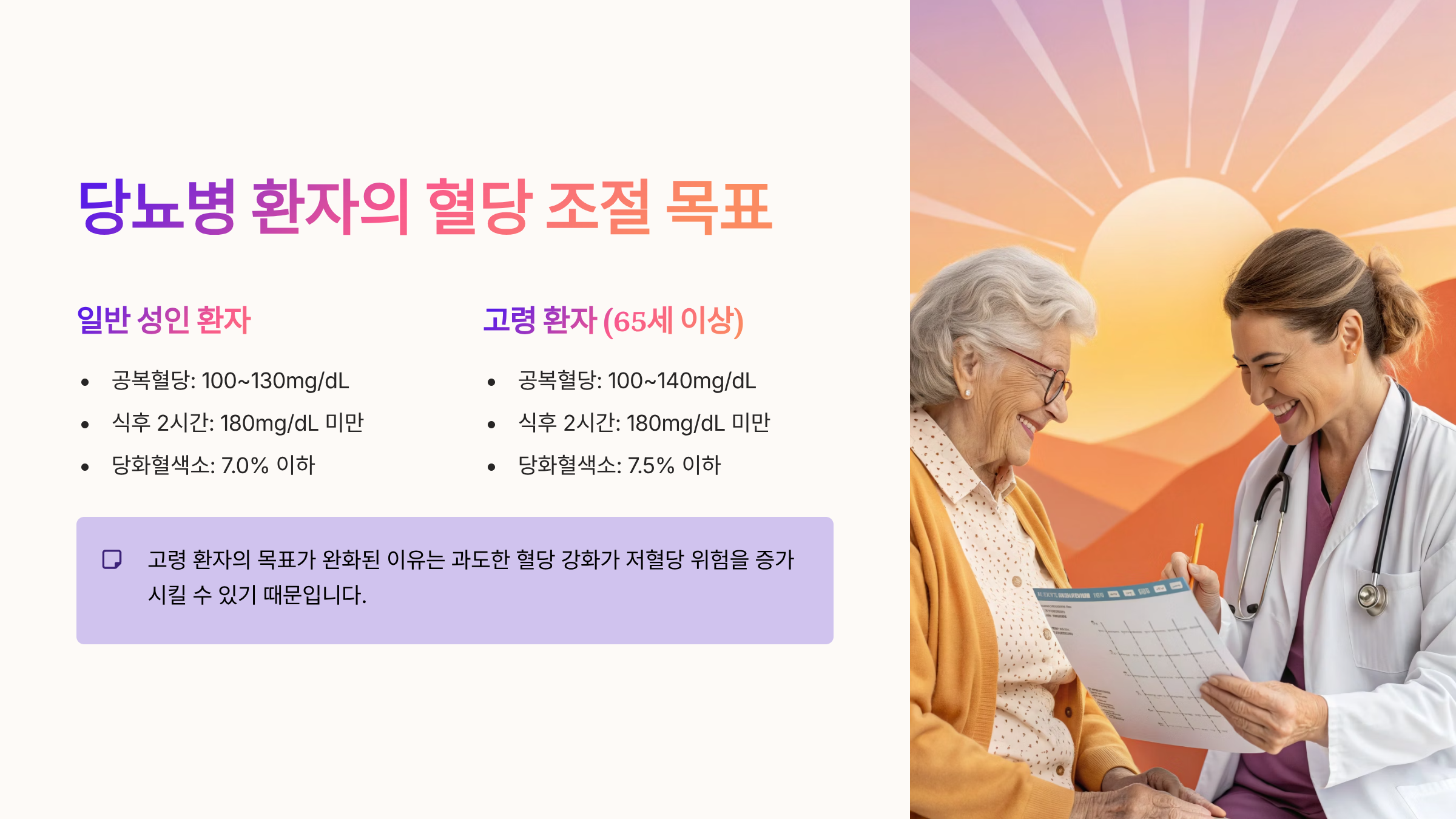 당뇨병 환자의 혈당 조절 목표는 환자의 나이, 당뇨병 유지 기간, 합병증 여부 등에 따라 다릅니다. 일반적인 성인 당뇨병 환자의 목표는 공복혈당 100~130mg/dL, 식후 2시간 혈당 180mg/dL 미만, 당화혈색소 7.0% 이하입니다. 다만 고령 환자(65세 이상)의 경우 당화혈색소 목표를 7.5% 이하로 설정하는 것을 권장합니다. 이는 과도한 혈당 강화가 저혈당 위험을 증가시킬 수 있기 때문입니다.
