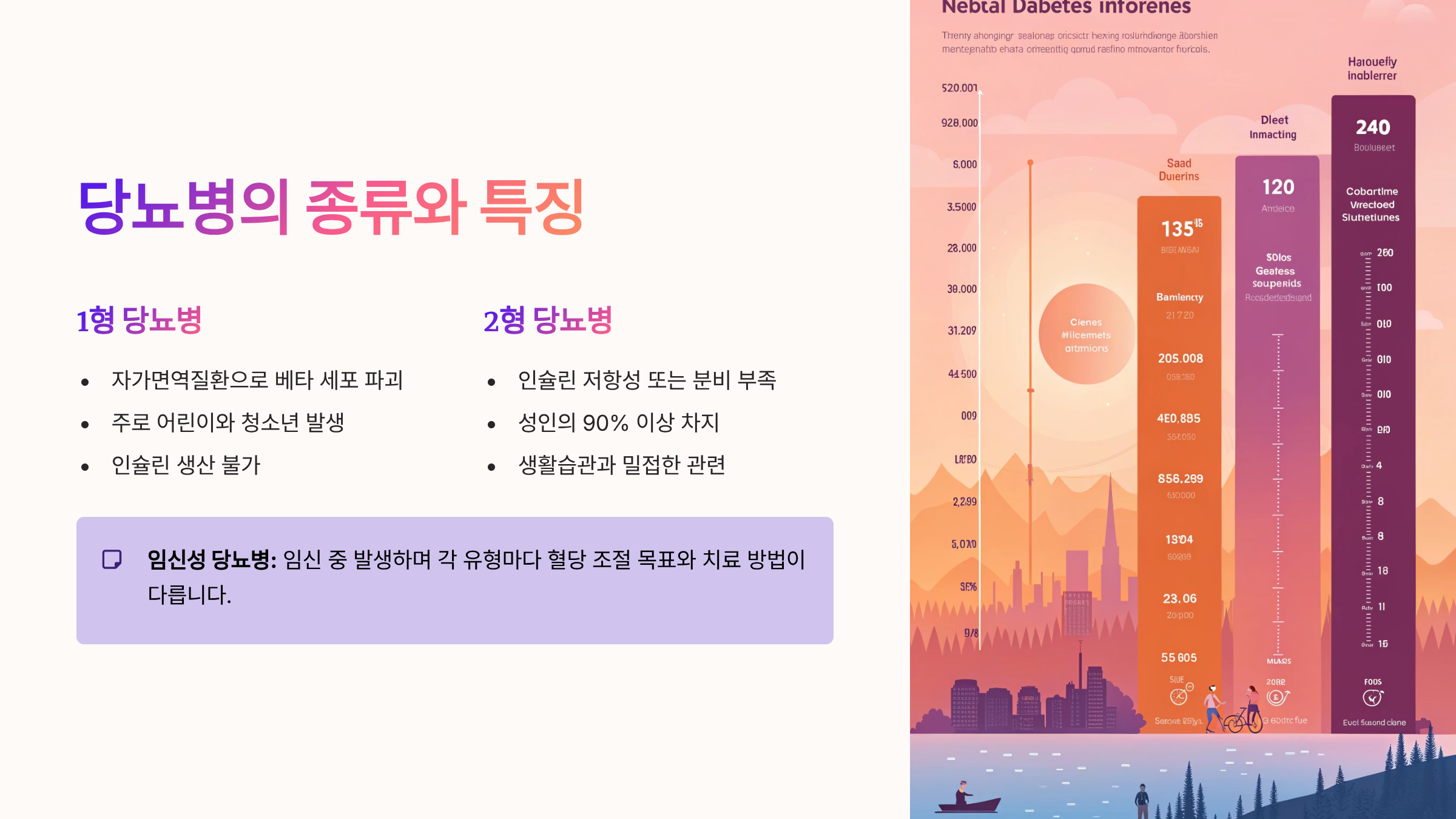 - 1형과 2형 당뇨병이 있으며, 각각 다른 발병 원인과 관리 방법 보유