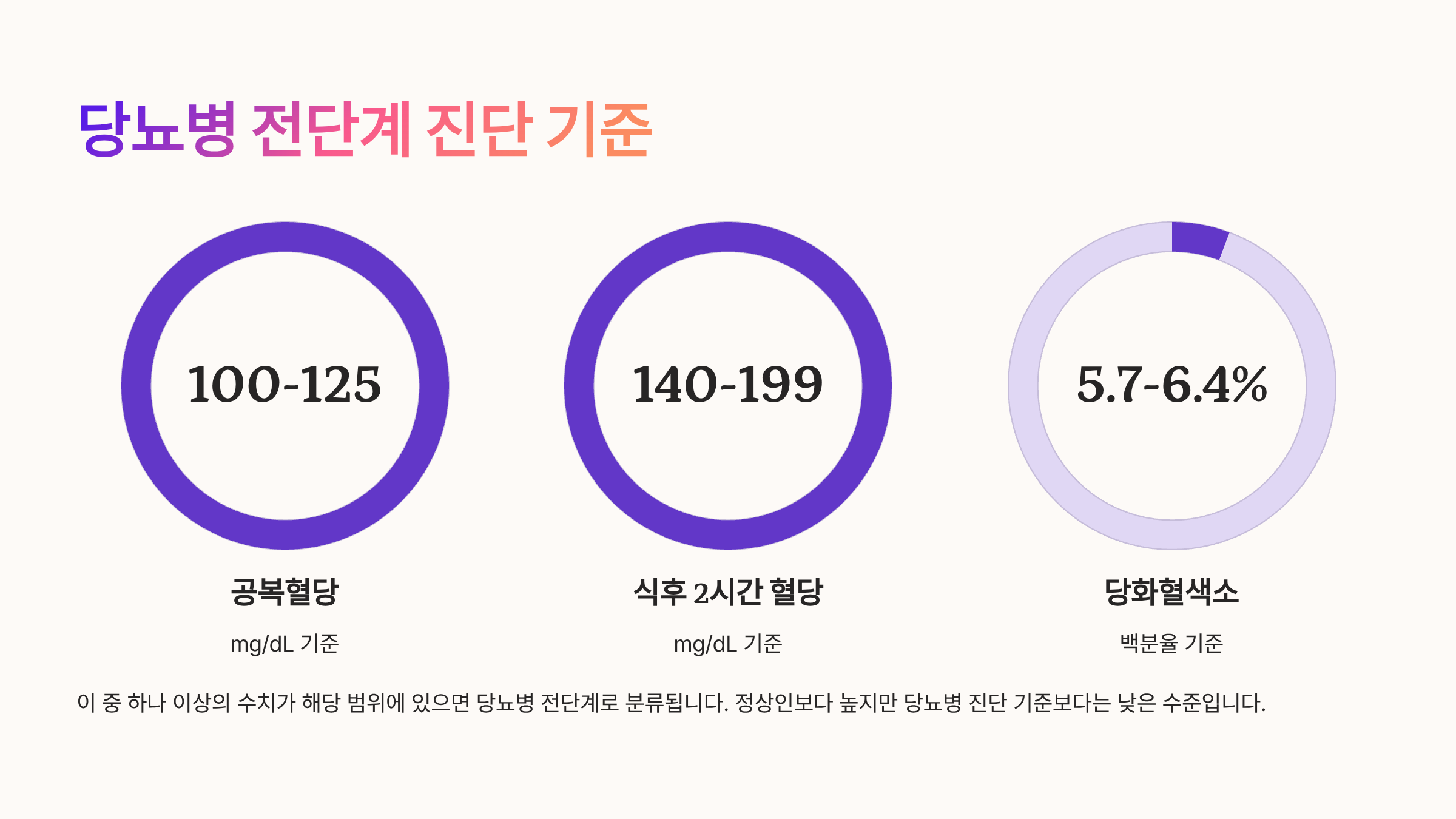 공복혈당 기준으로는 100~125mg/dL이 당뇨병 전단계입니다. 이는 정상인의 70~99mg/dL보다 높지만, 당뇨병 진단 기준인 126mg/dL 이상보다는 낮은 수준입니다. 식후 2시간 혈당 기준으로는 140~199mg/dL이 당뇨병 전단계에 해당합니다. 당화혈색소 기준으로는 5.7~6.4%가 당뇨병 전단계입니다. 이 중 하나 이상의 수치가 해당 범위에 있으면 당뇨병 전단계로 분류됩니다.