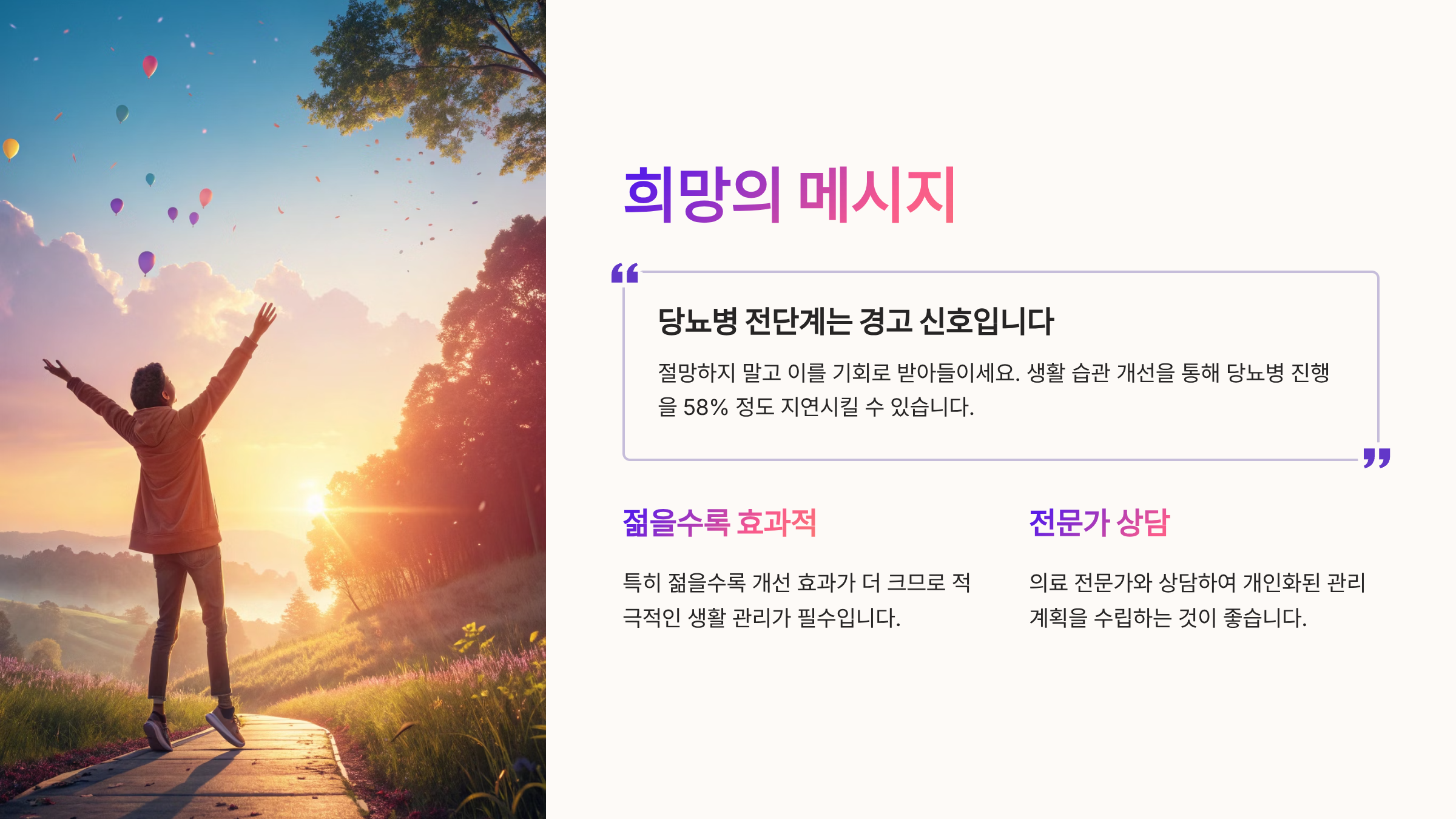 당뇨병 전단계 진단을 받았다면 절망하지 말고, 이를 경고 신호로 받아들이는 것이 중요합니다. 연구에 따르면 생활 습관 개선을 통해 당뇨병 진행을 58% 정도 지연시킬 수 있습니다. 특히 젊을수록 이러한 개선 효과가 더 크므로, 적극적인 생활 관리가 필수입니다. 의료 전문가와 상담하여 개인화된 관리 계획을 수립하는 것이 좋습니다.