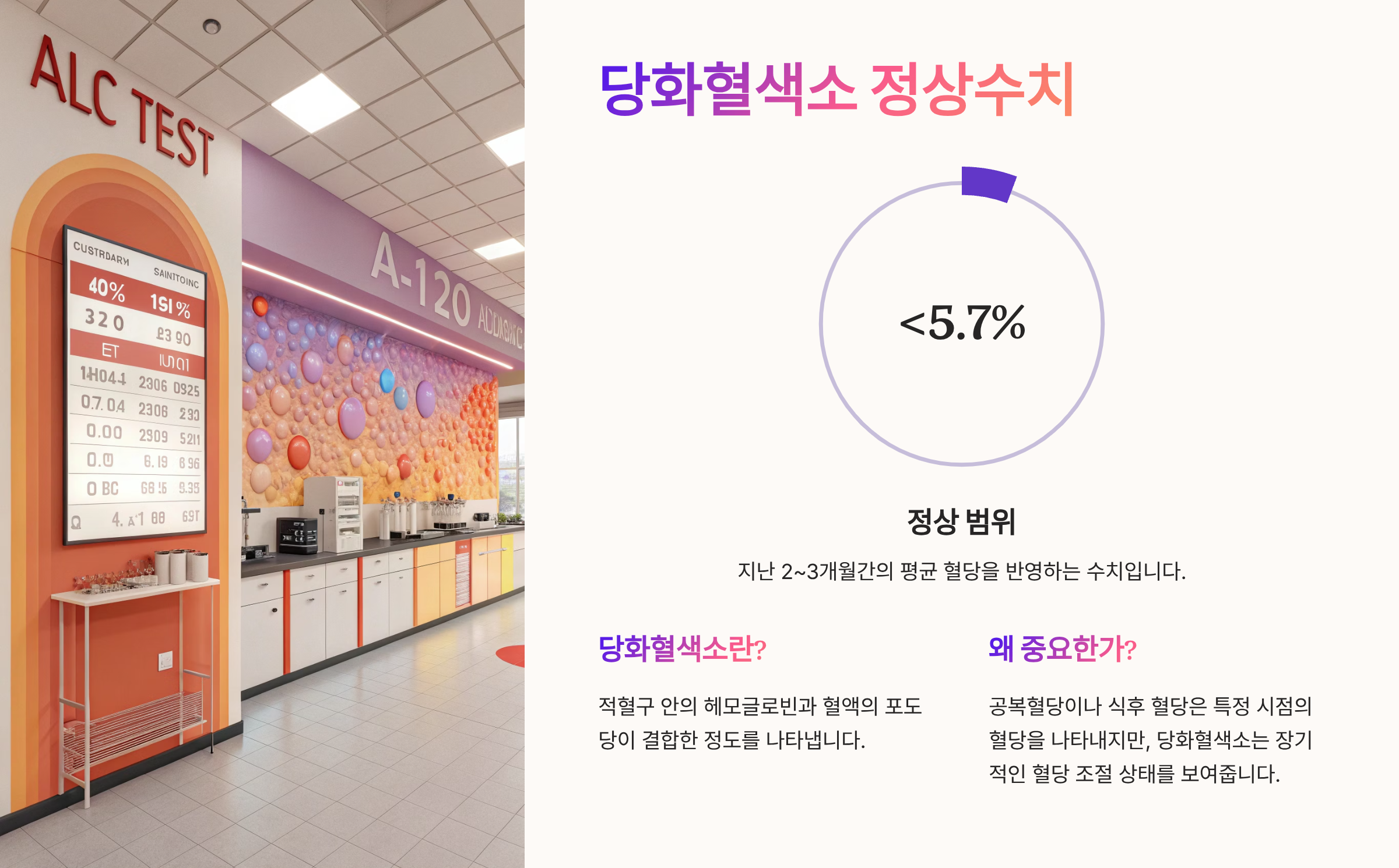 - 당화혈색소 5.7% 미만이 정상으로, 장기적인 혈당 조절 상태를 나타냄