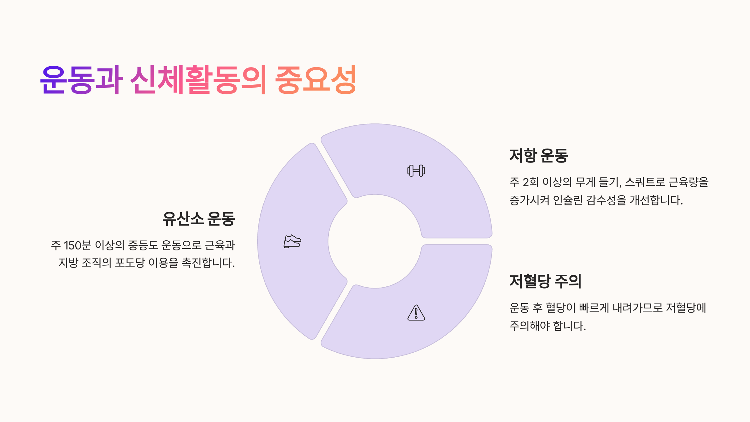 규칙적인 운동은 혈당 조절의 핵심입니다. 유산소 운동은 근육과 지방 조직이 포도당을 더 효율적으로 이용하도록 도와줍니다. 저항 운동(무게 들기, 스쿼트)은 근육량을 증가시켜 인슐린 감수성을 개선합니다. 일주일에 최소 150분의 중등도 유산소 운동과 주 2회 이상의 저항 운동을 권장합니다. 운동 후 혈당이 빠르게 내려가므로, 저혈당에 주의해야 합니다.
