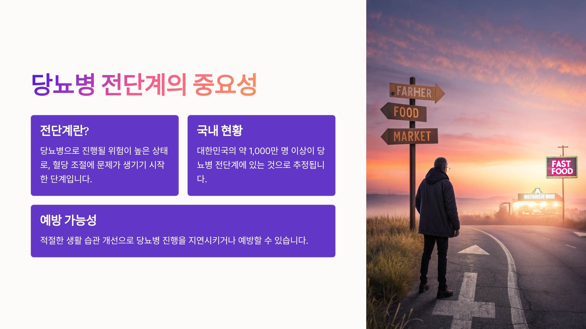 당뇨병 전단계는 당뇨병으로 진행될 위험이 높은 상태를 의미합니다. 이 단계의 사람들은 아직 당뇨병으로 진단되지 않았지만, 혈당 조절에 문제가 생기기 시작한 상태입니다. 대한민국의 경우 약 1,000만 명 이상이 당뇨병 전단계에 있는 것으로 추정됩니다. 이 단계에서 적절한 생활 습관 개선을 통해 당뇨병으로의 진행을 지연시키거나 예방할 수 있습니다.