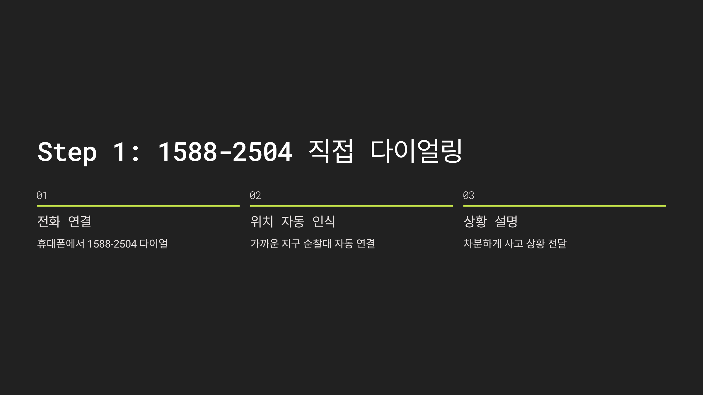 휴대폰에서 1588-2504를 누르고 상담원 연결을 기다립니다. 위치 자동 인식으로 가까운 지구 순찰대에 자동 연결됩니다. 연결 즉시 차분하게 사고 상황을 설명합니다.