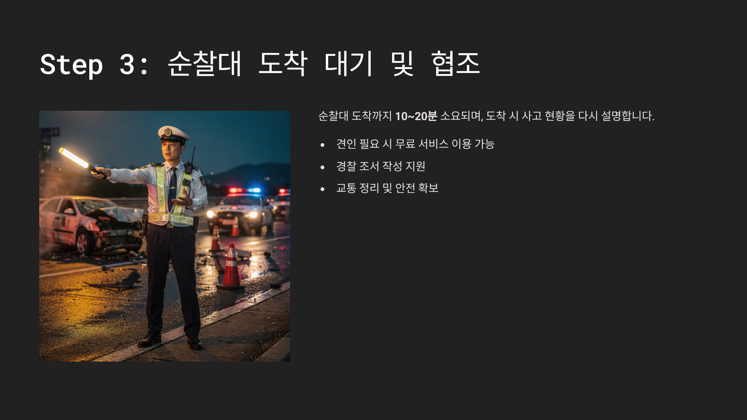 순찰대 도착까지 10~20분 소요되며, 도착 시 사고 현황을 다시 설명합니다. 견인 필요 시 무료 서비스 이용 가능하며, 경찰 조서 작성도 도와줍니다.