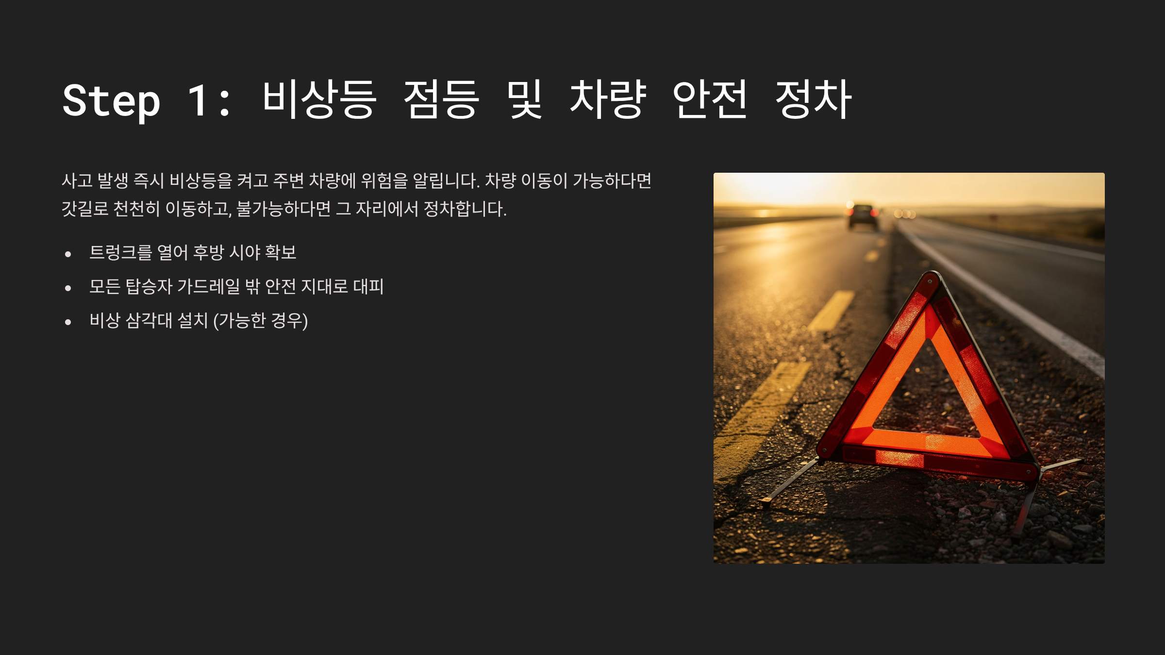 사고 발생 즉시 비상등을 켜고 주변 차량에 위험을 알립니다. 차량 이동이 가능하다면 갓길로 천천히 이동하고, 불가능하다면 그 자리에서 정차합니다. 트렁크를 열어 후방 시야를 확보하고 모든 탑승자가 가드레일 밖 안전 지대로 대피합니다.
